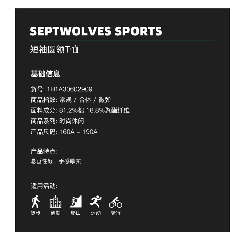 这款七匹狼男休闲T恤,是2020春夏新品,属于城市运动系列,采用81.2%棉+18.8%聚酯纤维的珠地网眼面料,拥有棉的柔软手感和功能面料的速干透气效果,适合各种运动场景,或爱出汗的人穿。