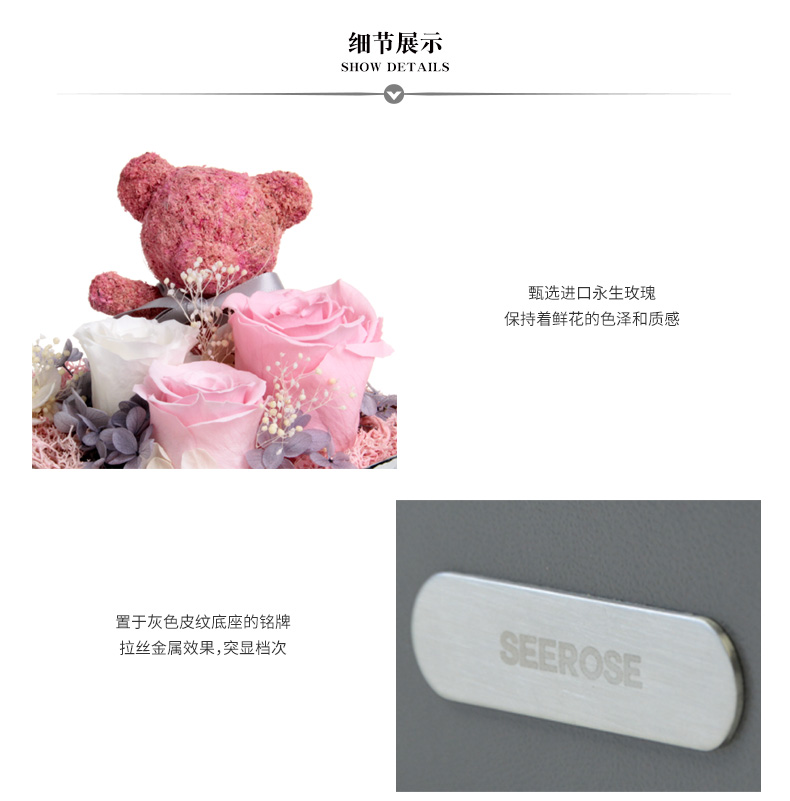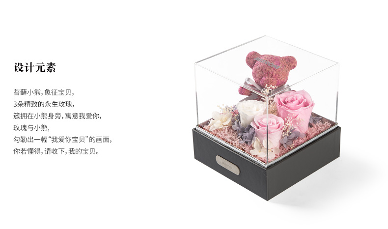 这款永生花礼盒内含三朵进口永生玫瑰花,粉白搭配,清新温柔,搭配永生绣球花,营造出微型花园的即视感,粉色苔藓小熊象征着宝贝,寓意为“我爱你宝贝”,搭配灰色皮纹底座,配色大牌,提升整体的品质感。