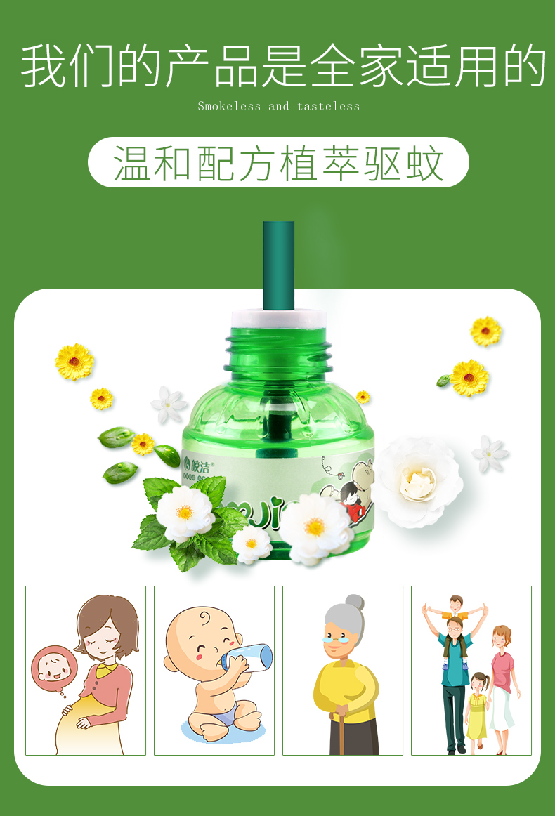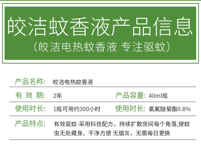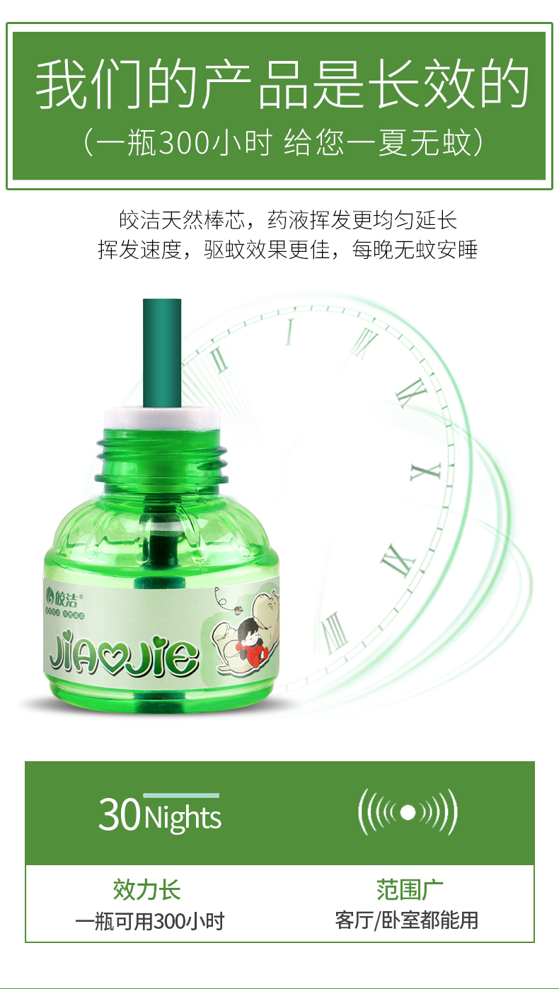 每瓶蚊香液可持续驱蚊300小时。蚊香液加热器的插头可以旋转90°,灵活性佳,可适应不同插座的空间需求。无线直插式,方便携带和收纳,使用更舒心。