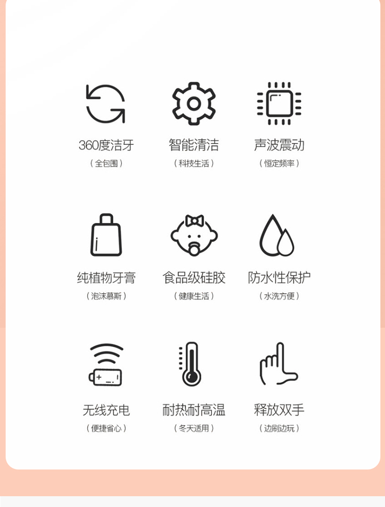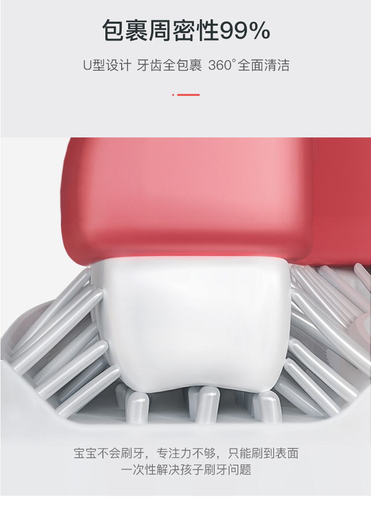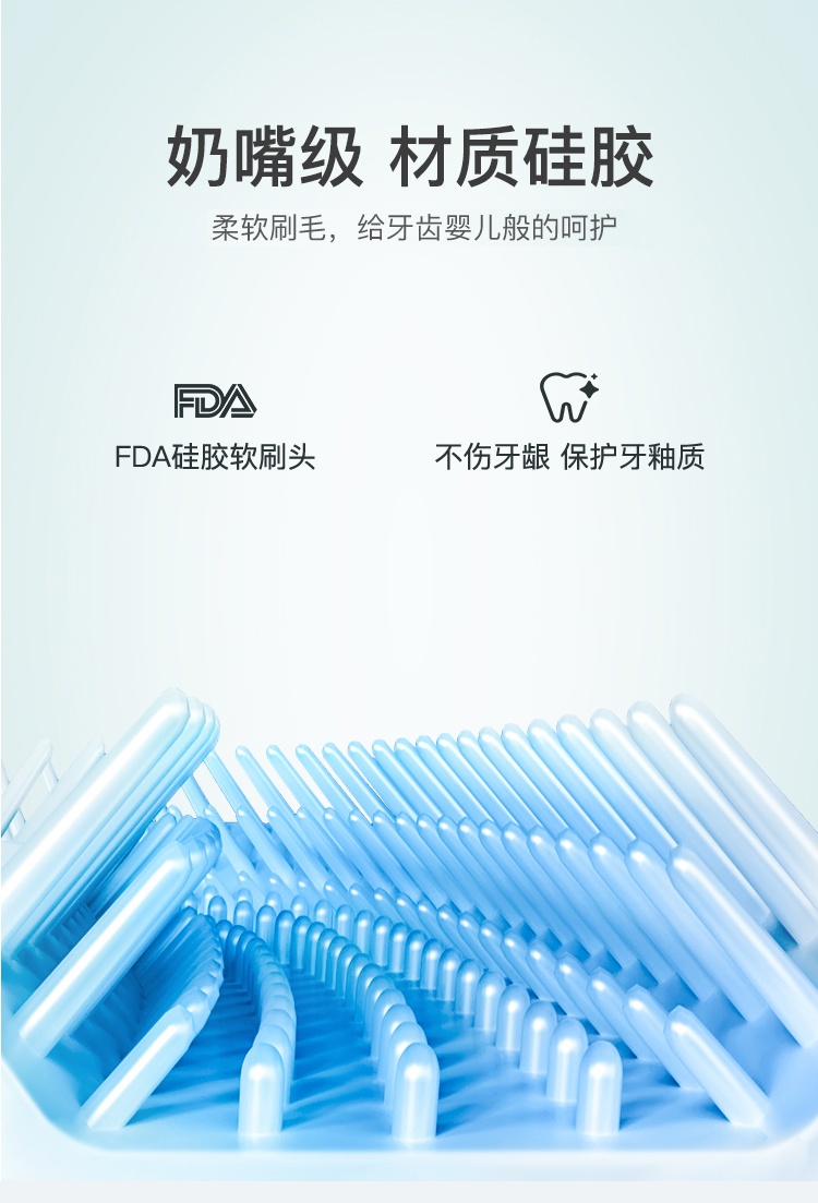 有轻柔按摩、柔和清洁、深度清洁3种模式。刷头FDA硅胶软刷头,符合人体工程学设计,360°U型全包裹,深层清洁口腔,触感柔软舒适,整机IPX7防水,内置锂电池,满电可续航15天。
