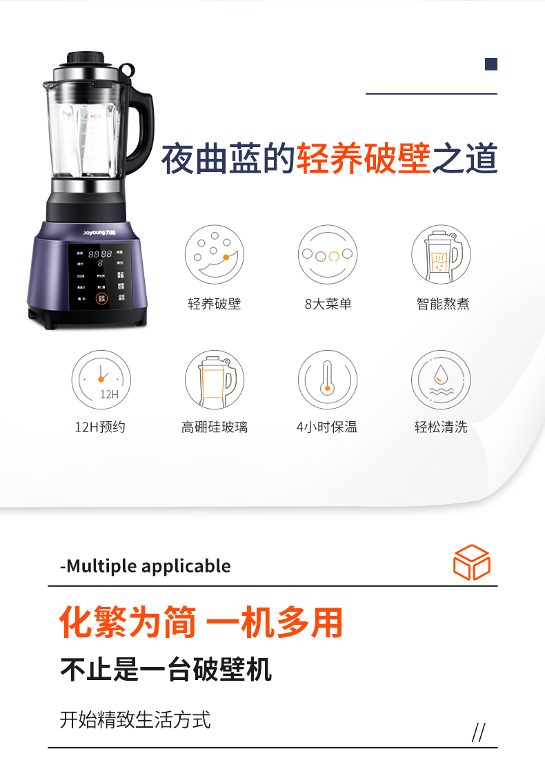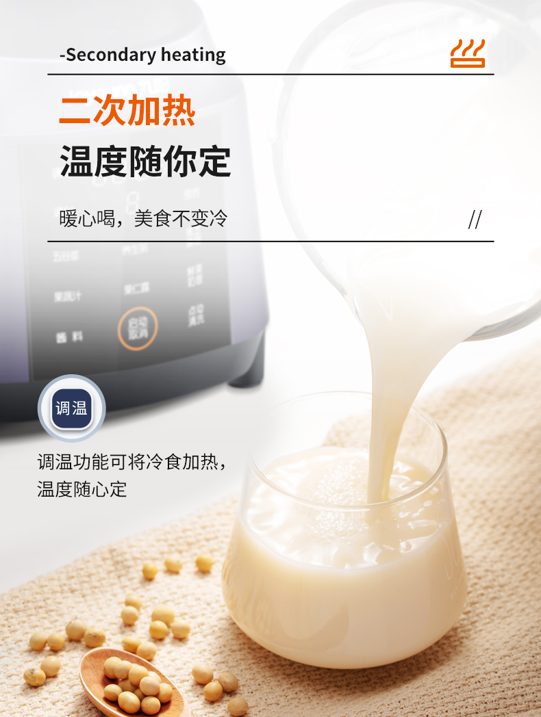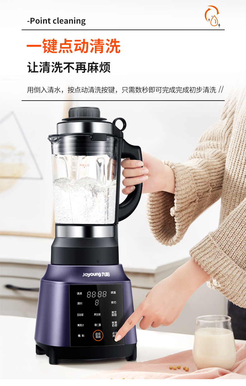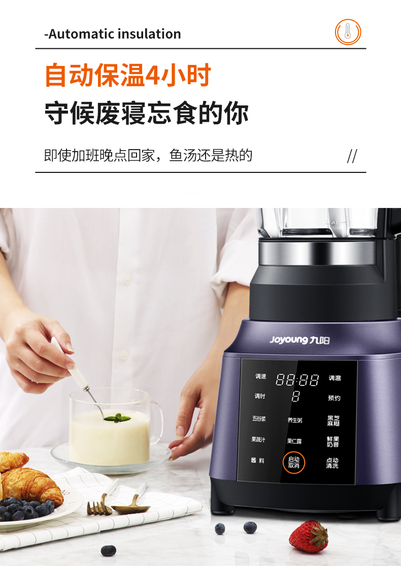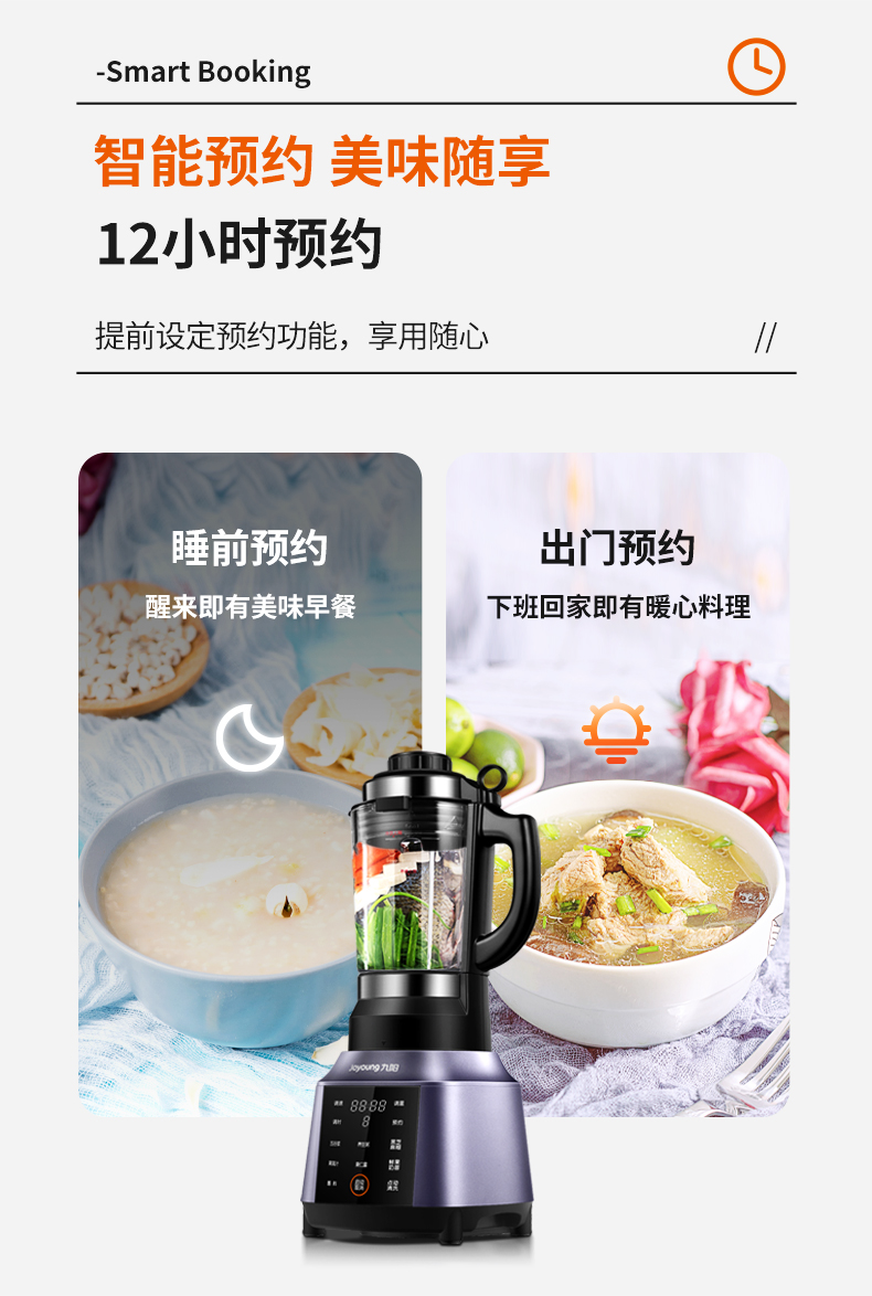 带12小时提前预约功能,底部散热系统,有一键清洗功能,清洗方便不留异味。在安全方面,防烫防滑手柄、开盖断电保护、中空进料孔、防烫杯盖。
