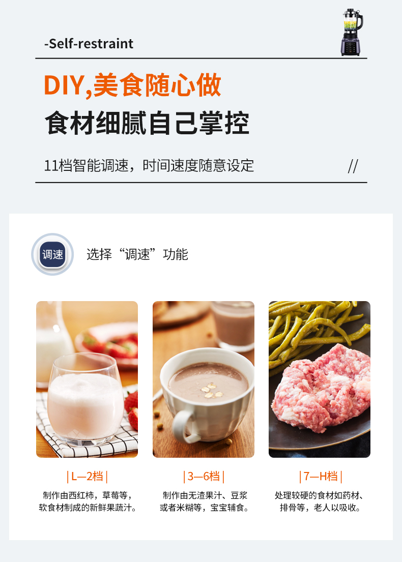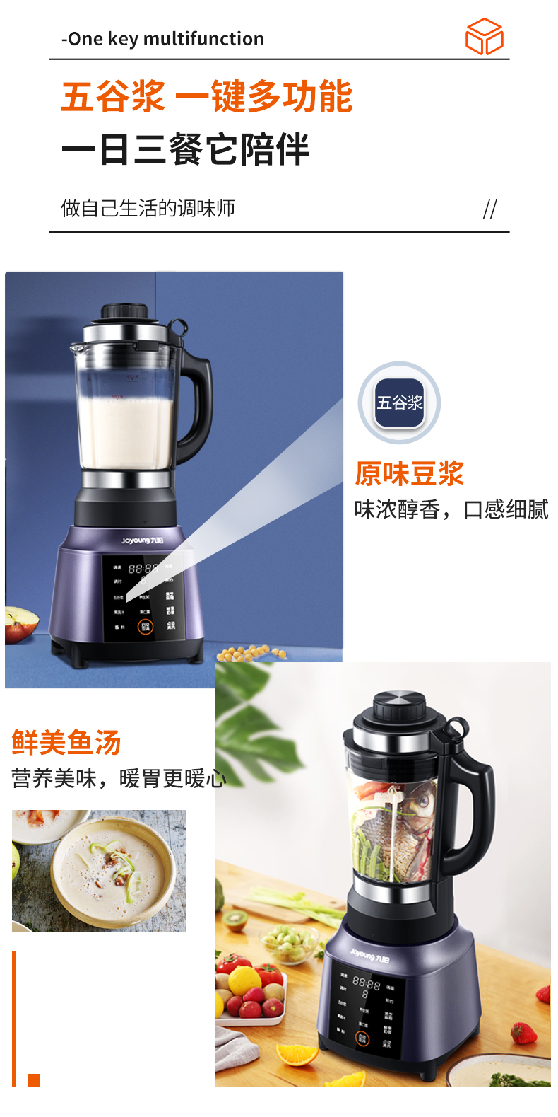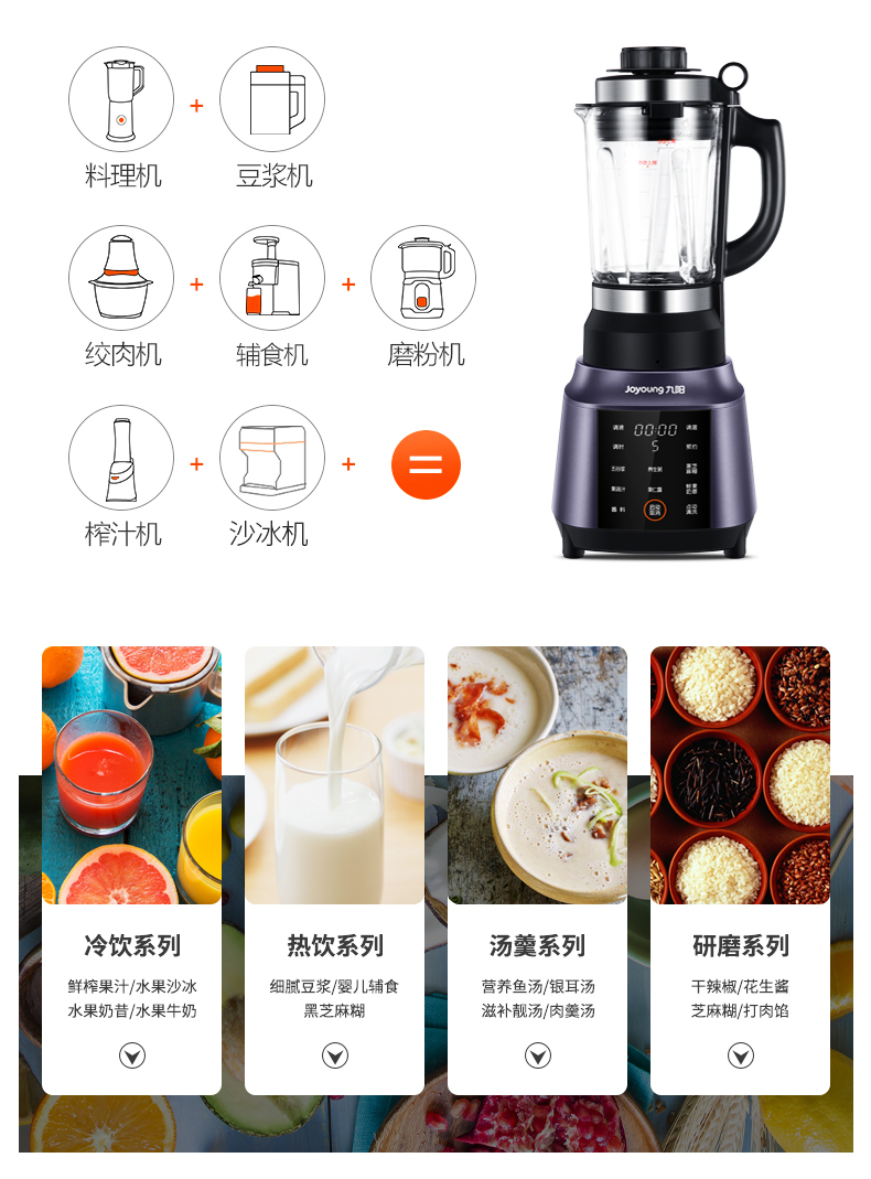 九阳的这款破壁料理机,集合了集料理机、豆浆机、咖啡机、绞肉机、辅食机、研磨机、沙冰机、果汁机等产品功能,可用来做豆浆、米糊、五谷汁、玉米汁、果蔬汁、沙冰,甚至能将整条鱼、排骨等,直接打成细腻骨汤,完全达到一机多用功能。