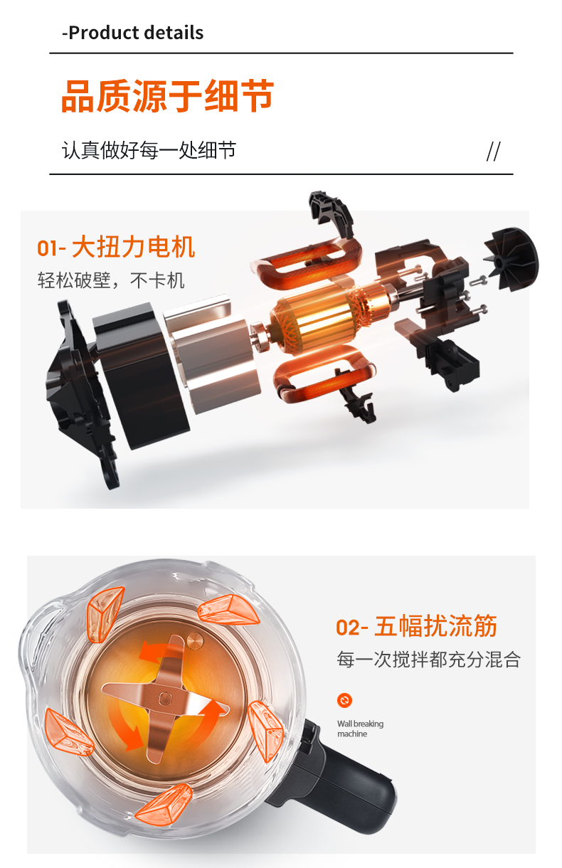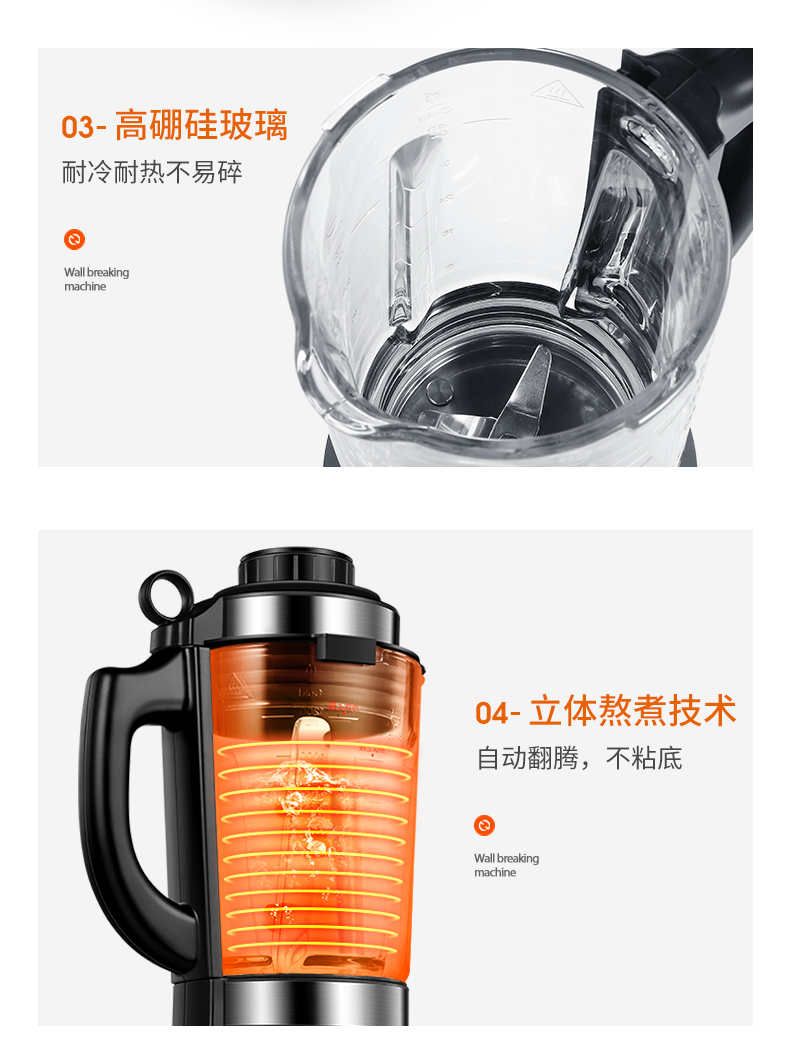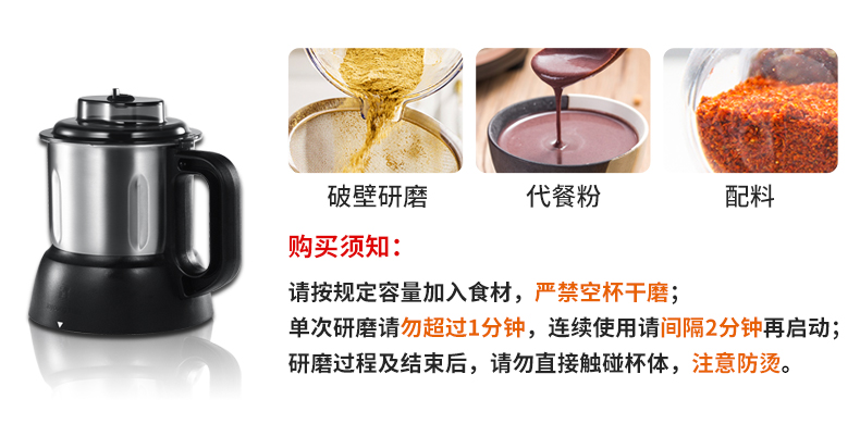 搅拌杯是加厚高硼硅玻璃制成,可耐受120℃温差骤变不破裂,高强度耐震动,结构更牢固不易碎,破壁效果更佳,杯盖顶部还有中空进料口,可以随时加料;金属材质的需要担心是不是304不锈钢,不是304的会有重金属析出。
