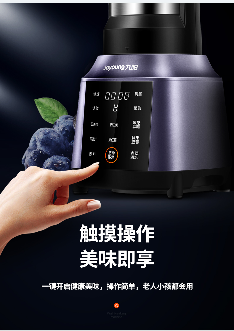 智能触摸面板,屏幕大清晰,高敏电容屏,反应灵敏,有12个按键菜单,分别是黑芝麻糊、冰糖雪梨、启动/取消、五谷浆、养生粥、玉米汁、果蔬汁、果仁露、果蔬泥、鲜果奶昔、预约、点动/清洗。