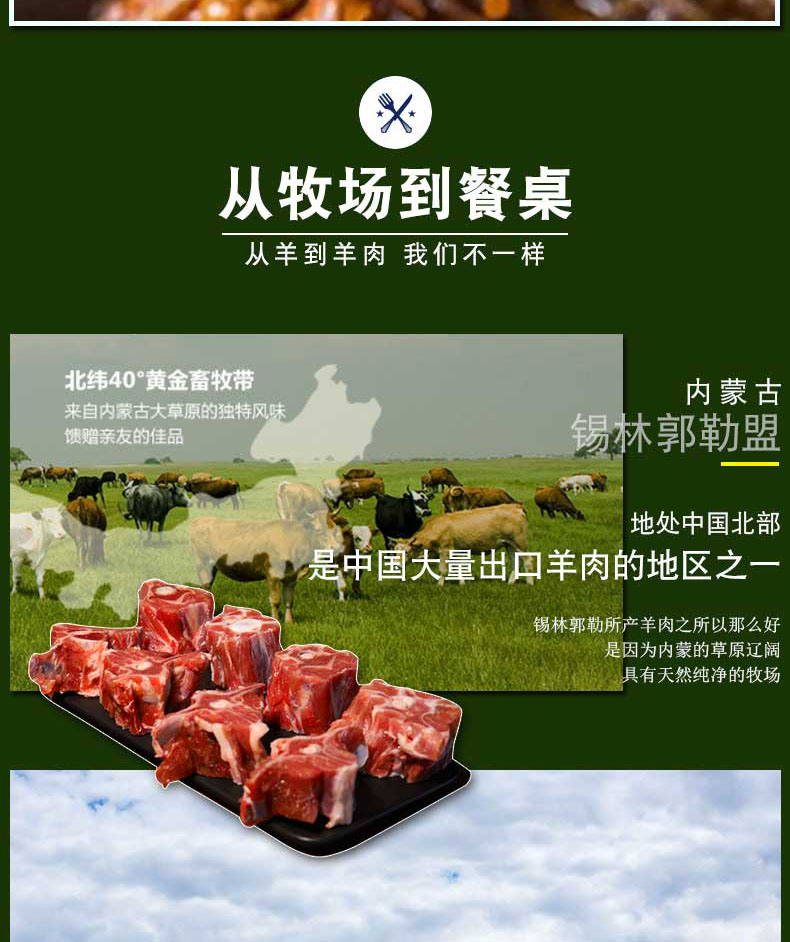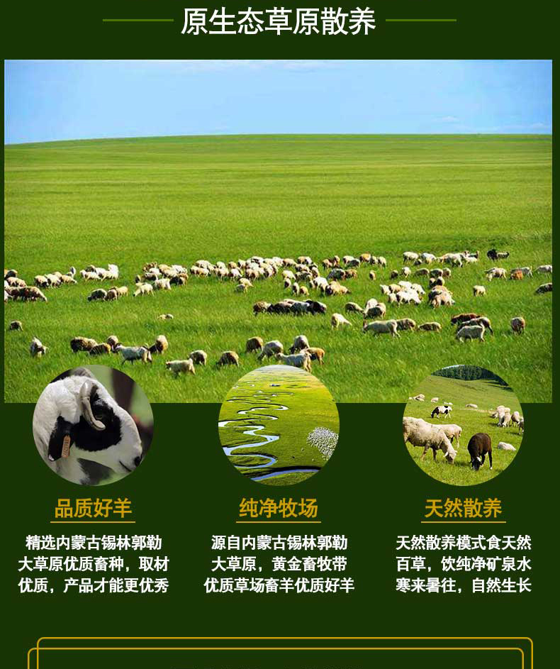 乌珠穆沁羊肉质细嫩,味美多汁,高蛋白、低脂肪、无膻味,而且水分低,富含钙、铁、磷等物质,所含人体必备的几种氨基酸明显高于其它羊肉;这些特点都是由乌珠穆沁羊生长地域、土壤、水质、气候、植被等自然环境所决定的。