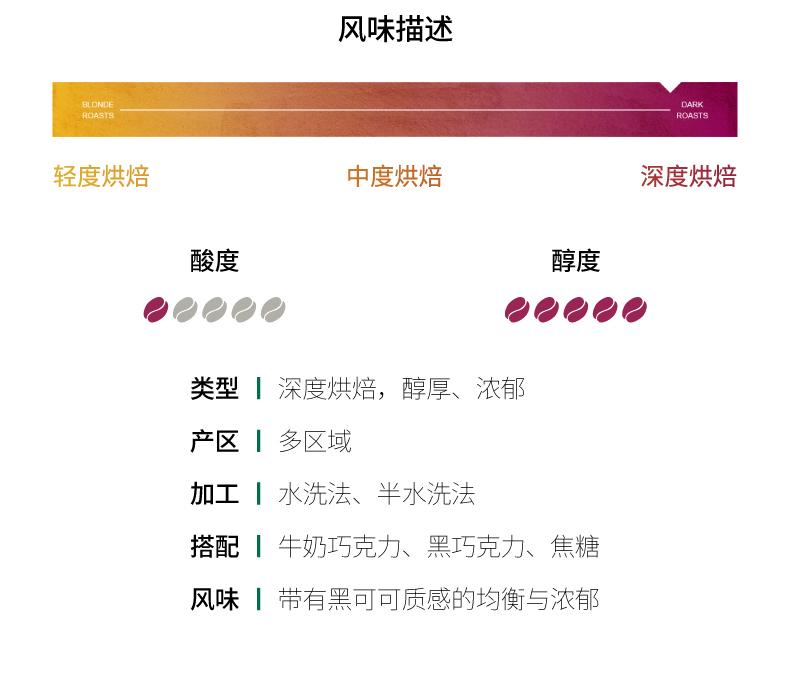 有浓缩咖啡豆-重度烘焙、佛罗娜粉-重度烘焙、派克咖啡豆-中度烘焙、派克咖啡粉-中度、特选综合咖啡粉-中度烘焙可选,具体口感分别如下。