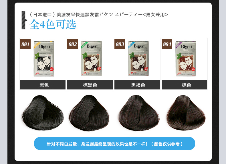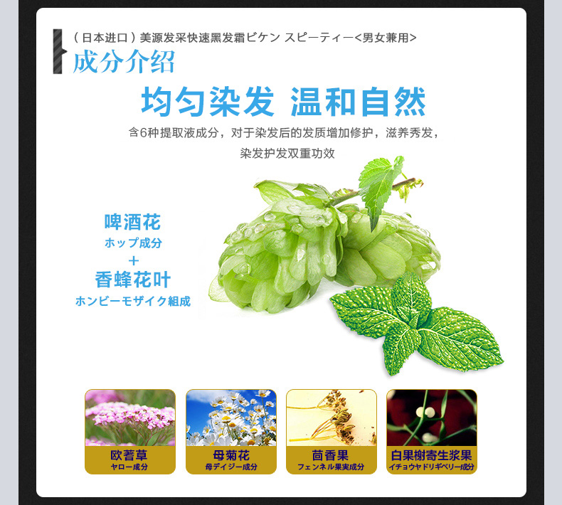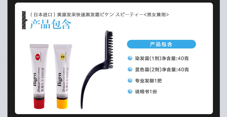 这款Bigen 美源发采 快速黑发霜,选用植物精华,内含母菊花、啤酒花、欧薯草、香蜂花叶、茴香草等职务成分,安全健康。可以快速遮白,白发变黑发之后,色泽自然,柔润亮泽,没有突兀感。用法简单,在家即可操作,男女均可使用。
