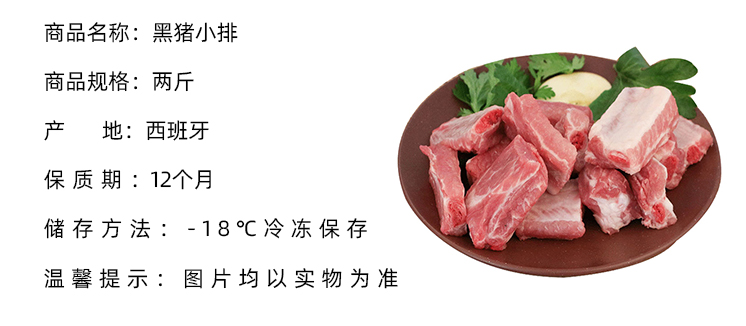 这款 精肋排,伊比利亚进口,优选当地赫赫有有名的黑猪品种,原生态环境中放养在山林中,食用当地盛产的橡果,其肉质鲜嫩,还带有橡果的香味,无瘦肉精、无激素、无抗生素,食用更放心。规格:2斤