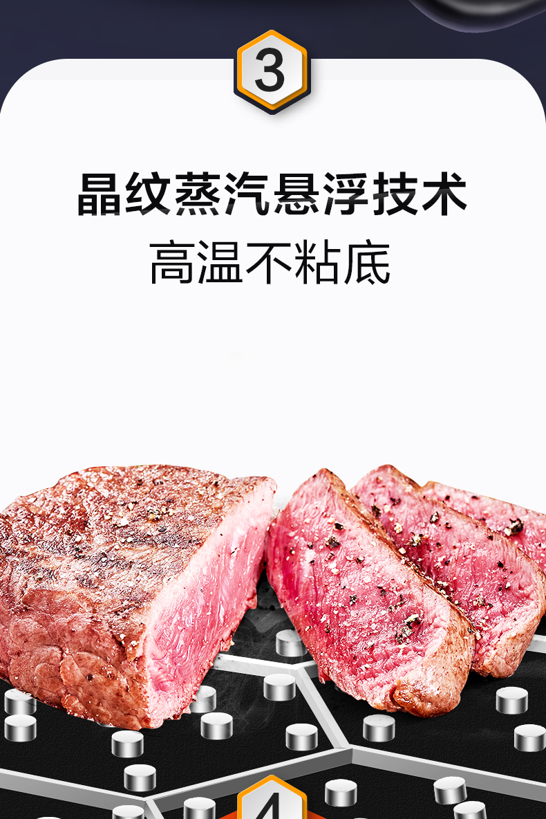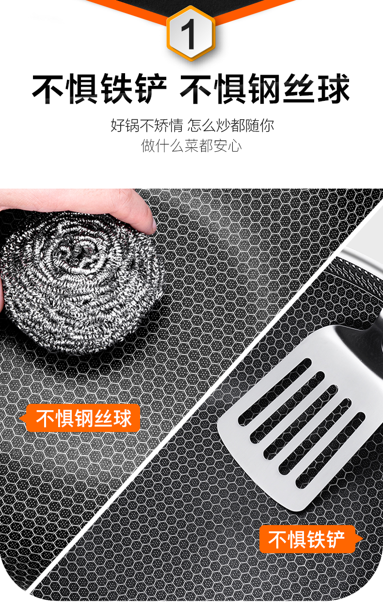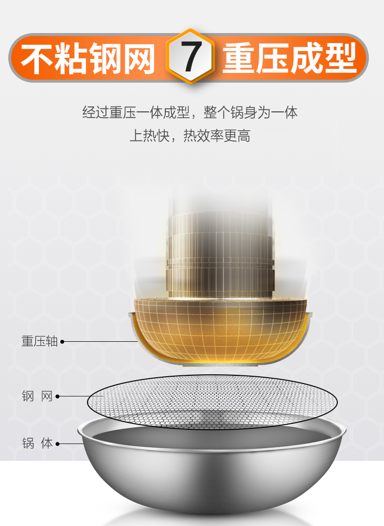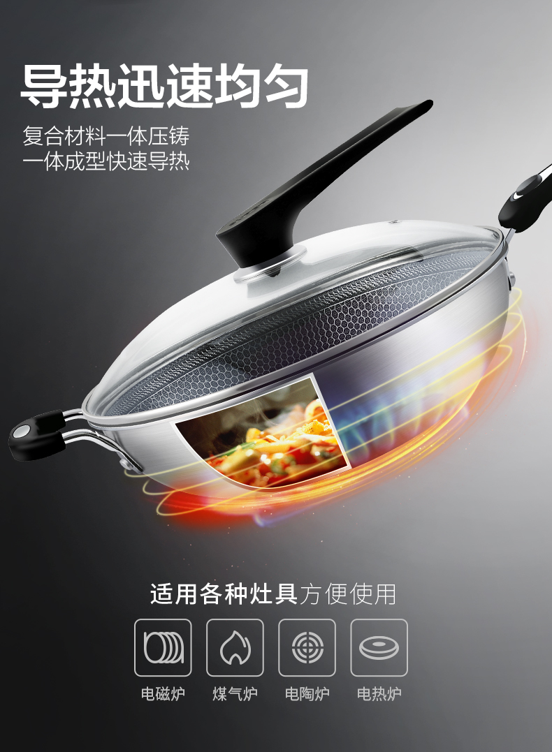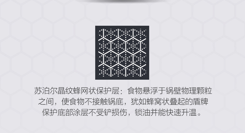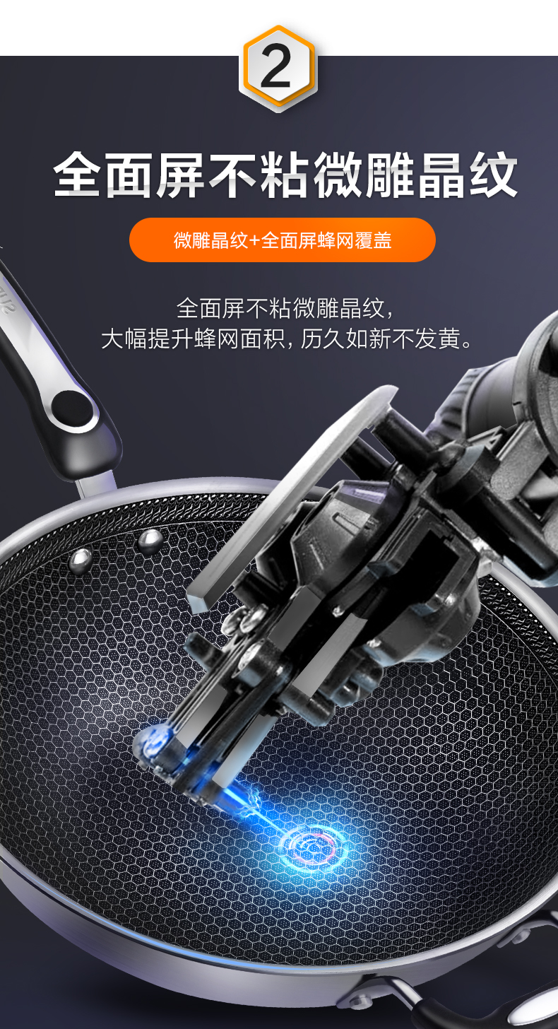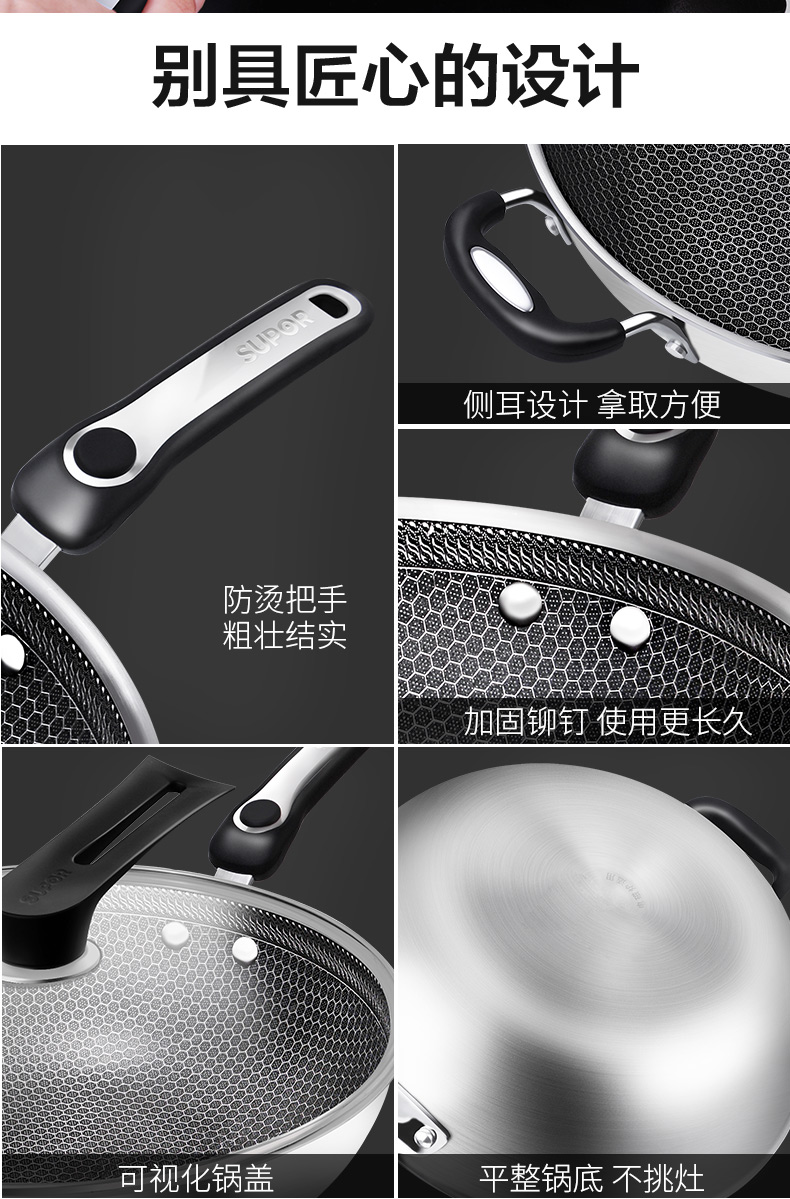 不粘方面,内里为微雕晶纹+全面屏蜂网设计,可实现蒸汽悬浮技术,且不易粘锅糊底,一冲即净,仅产生轻微油烟;且无涂层不怕剐蹭。细节上,加固铆钉设计,坚固耐用,可视钢化玻璃锅盖,清洗查看锅内情况,细节贴心细致。