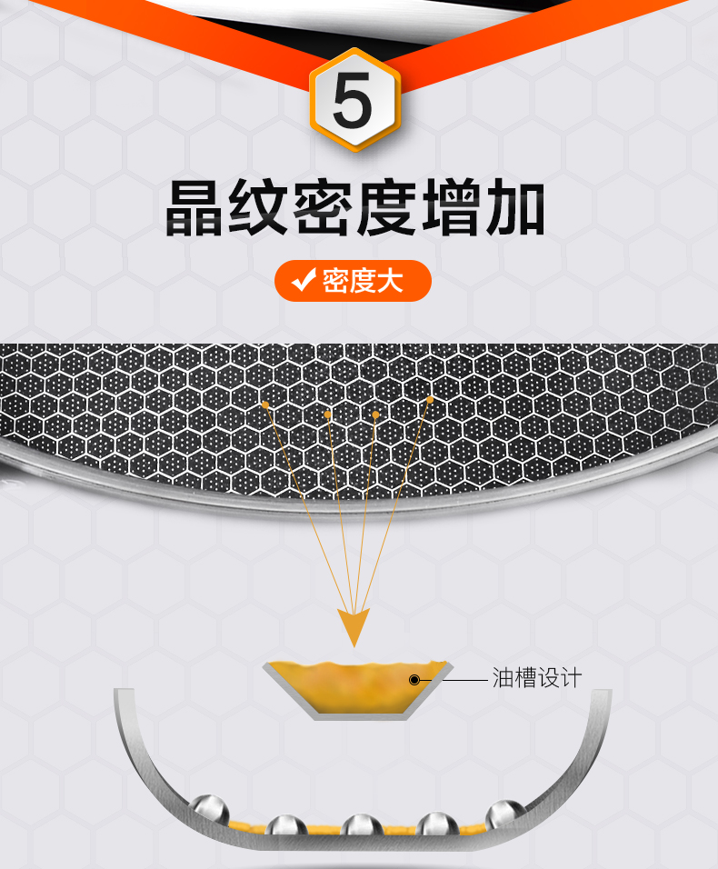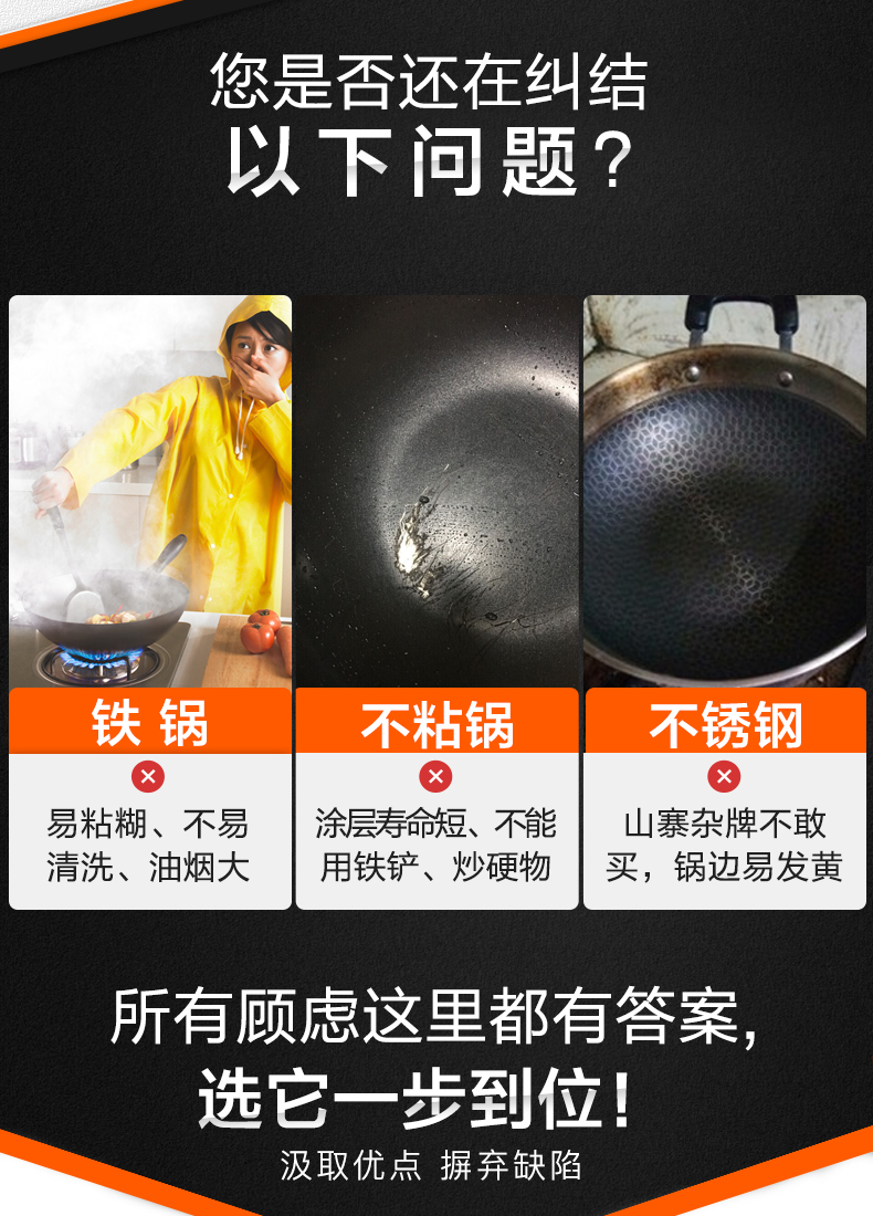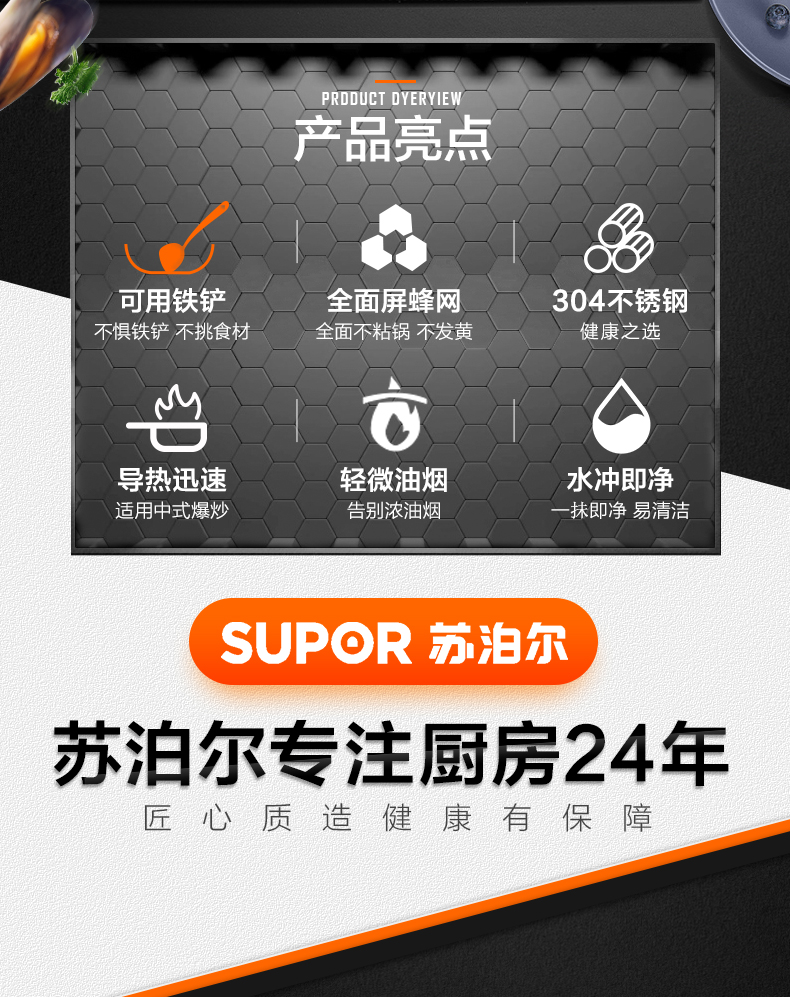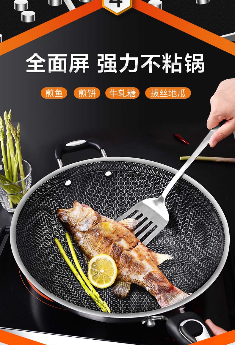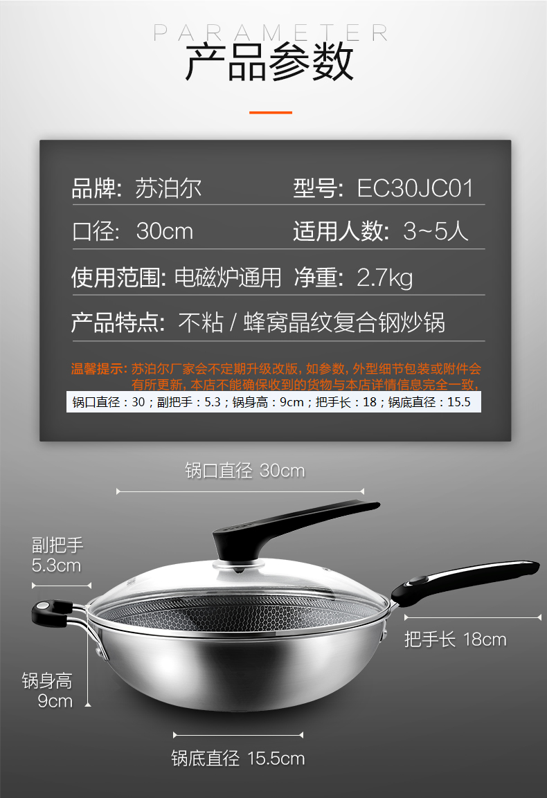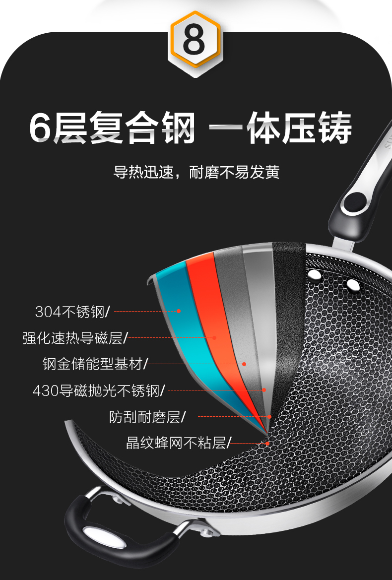 不粘方面,内里为微雕晶纹+全面屏蜂网设计,可实现蒸汽悬浮技术,且不易粘锅糊底,一冲即净,仅产生轻微油烟;且无涂层不怕剐蹭。细节上,加固铆钉设计,坚固耐用,可视钢化玻璃锅盖,清洗查看锅内情况,细节贴心细致。