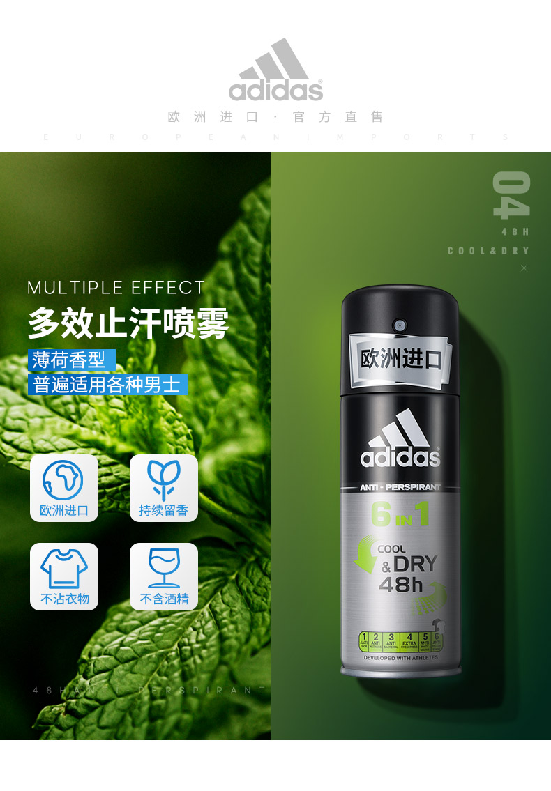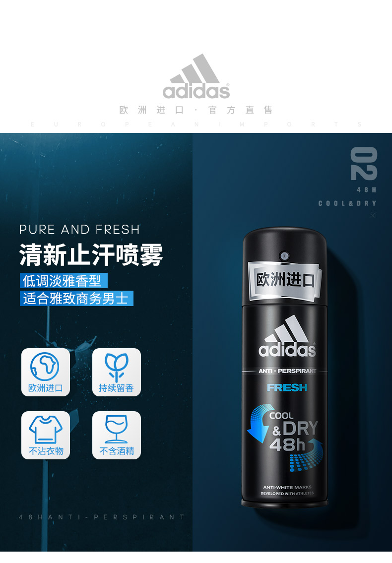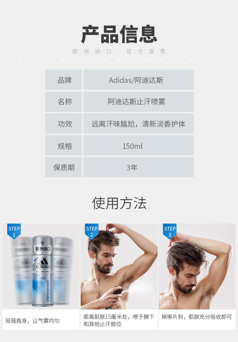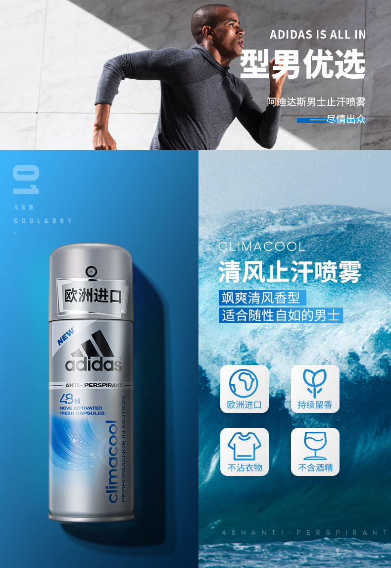 阿迪达斯止汗喷雾,欧洲进口,微盐爽身配方,不含酒精,不沾衣物,适合任何肌肤,可长时间保持皮肤清爽少汗,去异味,自然花香,清新淡雅,香体护肤,告别腋下狐臭异味尴尬,祛散发迷人魅力,清新整个夏季~