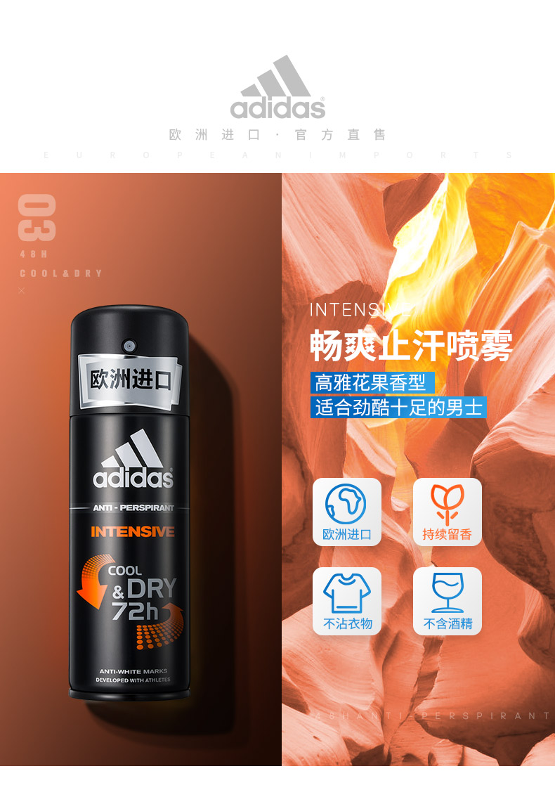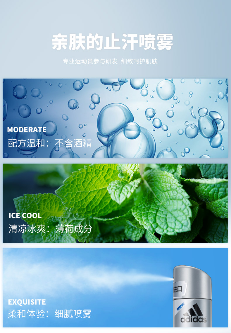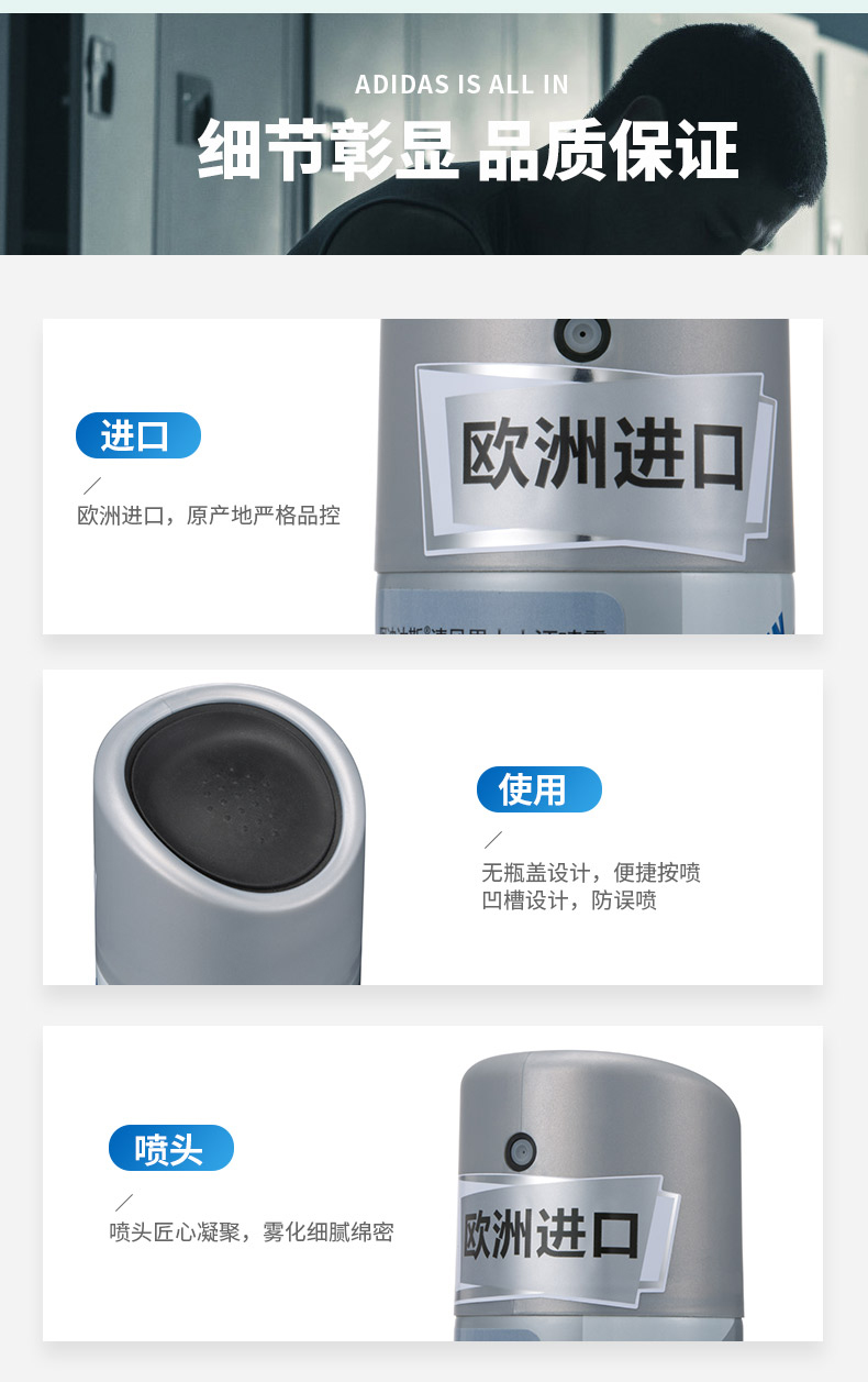 阿迪达斯止汗喷雾,欧洲进口,微盐爽身配方,不含酒精,不沾衣物,适合任何肌肤,可长时间保持皮肤清爽少汗,去异味,自然花香,清新淡雅,香体护肤,告别腋下狐臭异味尴尬,祛散发迷人魅力,清新整个夏季~