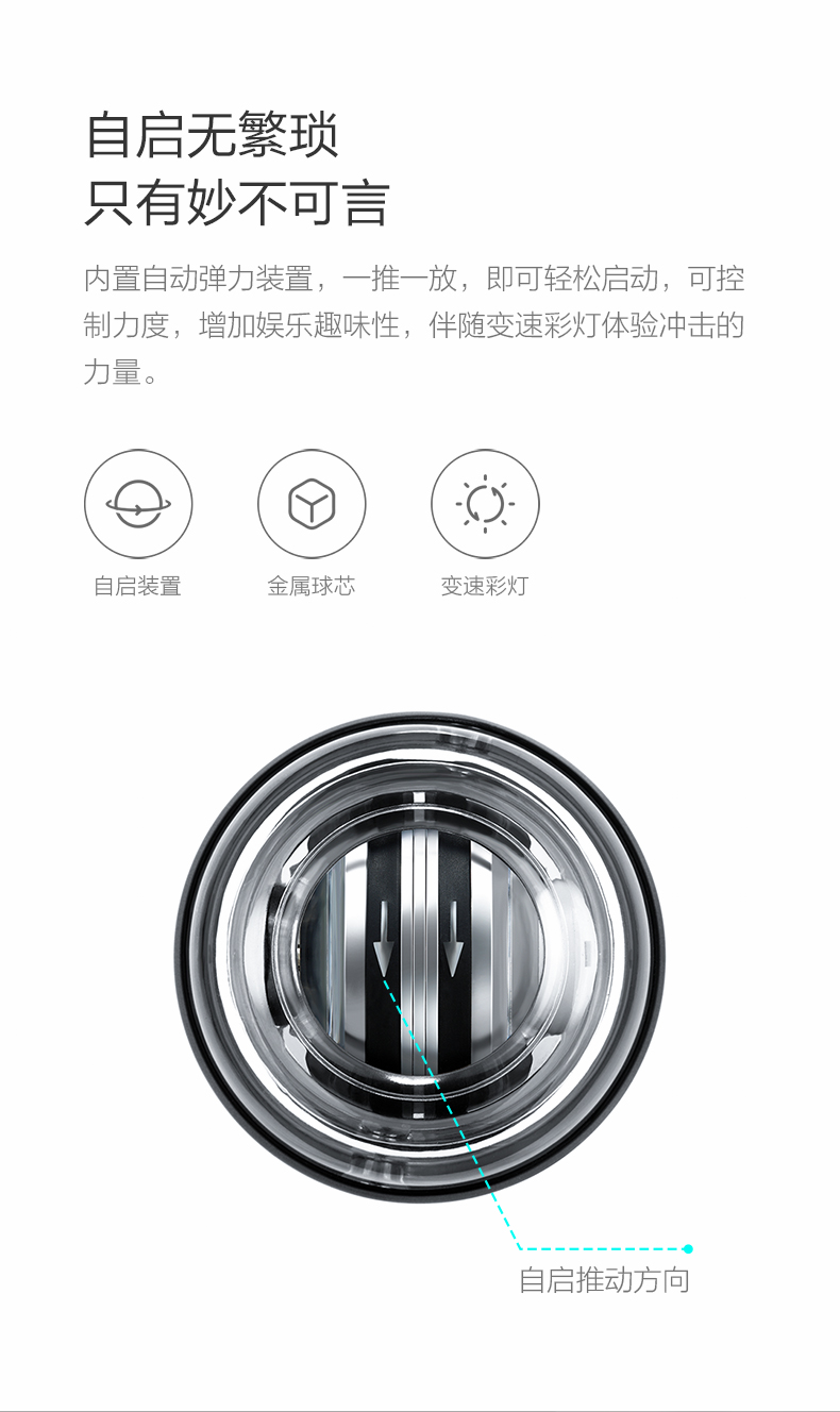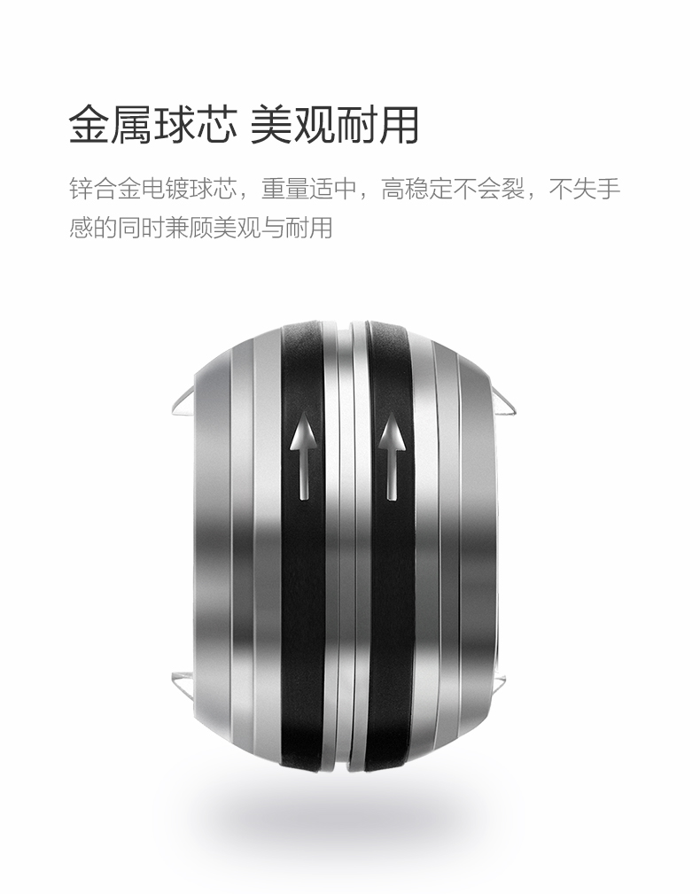通过人为控制,可以任意调节球芯旋转的节奏和速度,速度越快则产生的力量越大,可相当于不同重量的哑铃,是训练健身,减压利器,据说世界纪录已超过20000转/分钟。