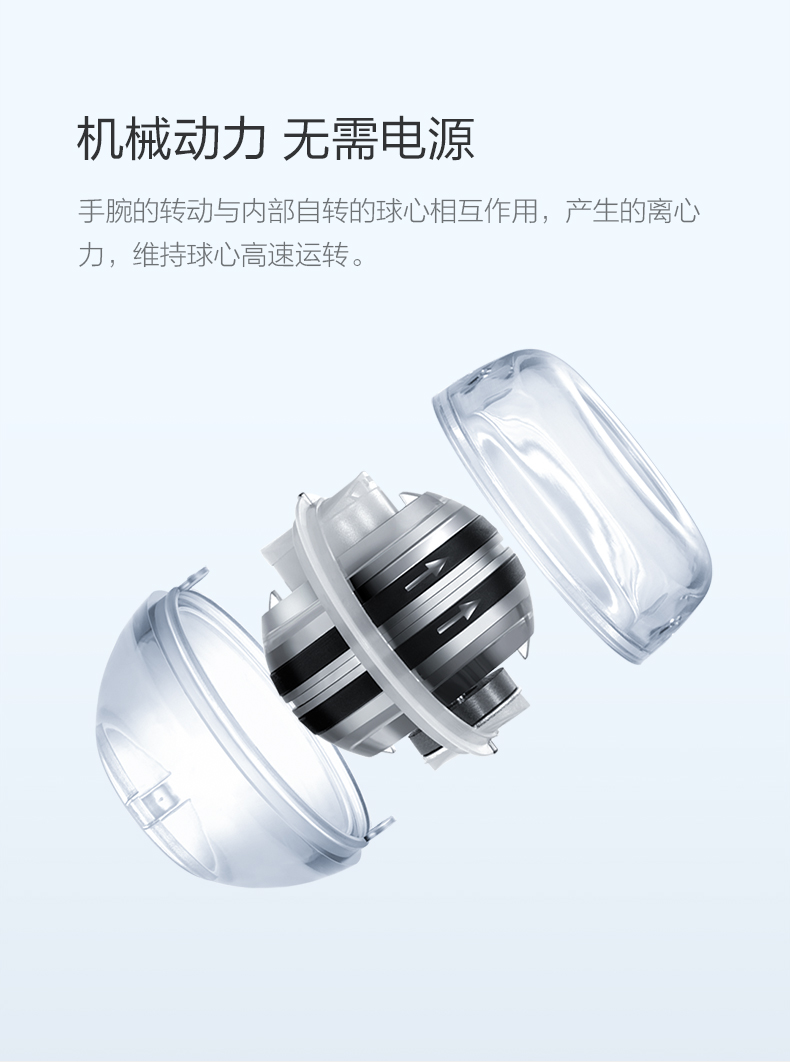 腕力球纯机械,不用电池和任何电源,没有电磁辐射,运用陀螺仪和角动量守恒原理,在惯性定律和角动量作用下持续旋转并产生强大的力量,使手腕、手臂处于自主运动状态。靠手腕的转动带动球芯高速旋转,进而产生强大的力量。