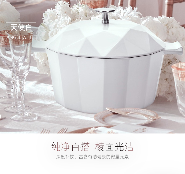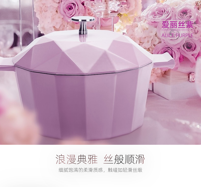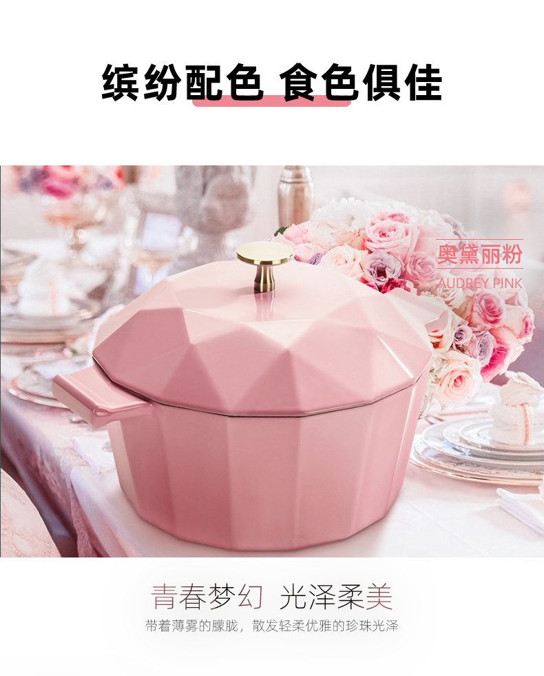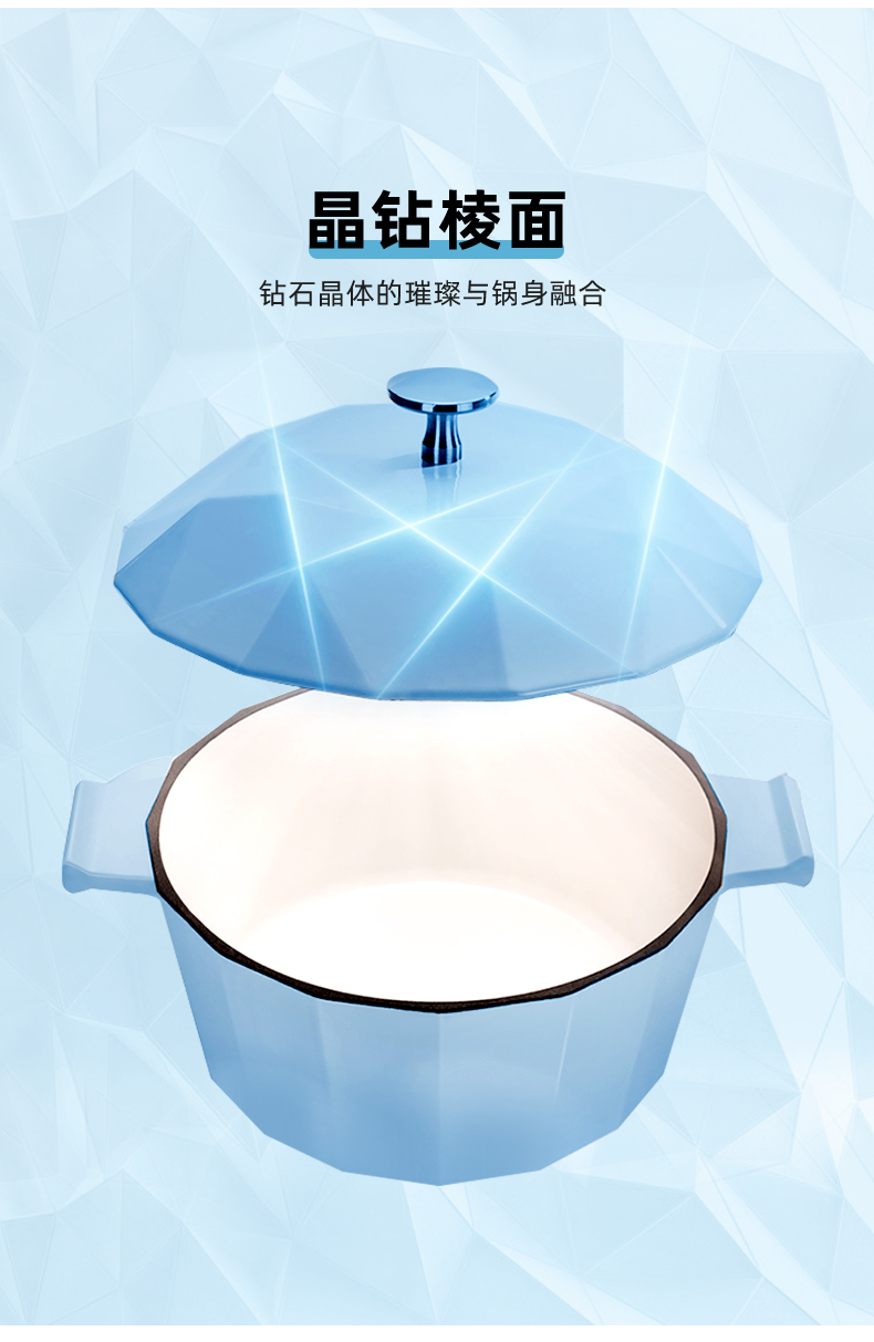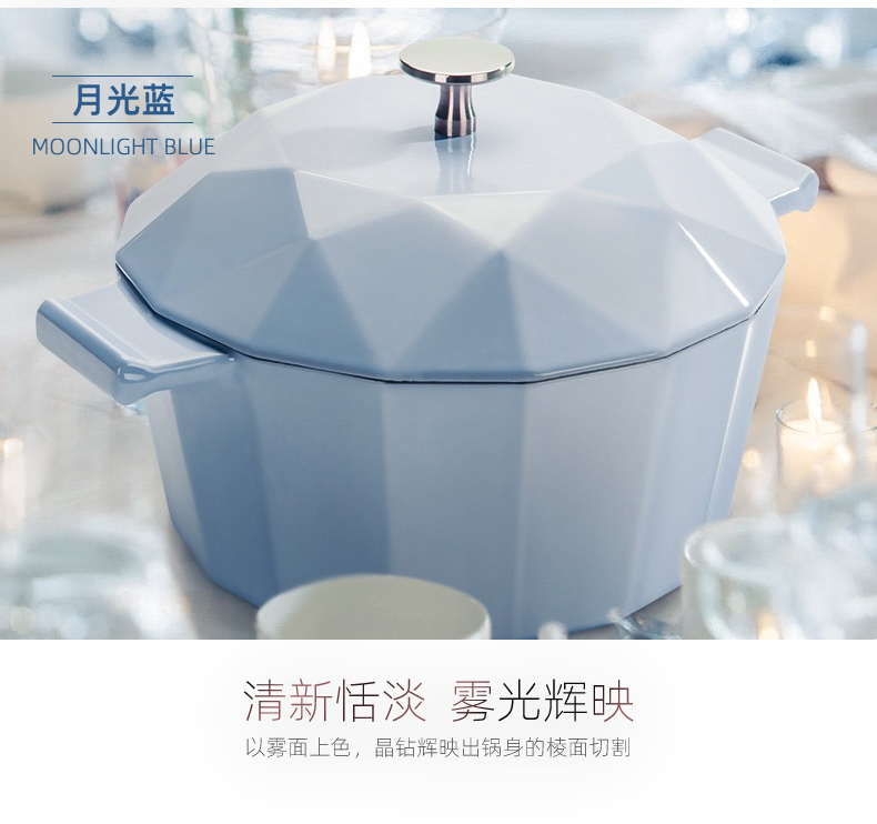 整体摩登造型,锅面和锅身都是晶钻切割棱面设计,颜值非常高。两侧的把手和锅体是一体成型的,安全稳定好握取,由于锅的颜值高,锅内食物可以不用装盘直接整锅上。