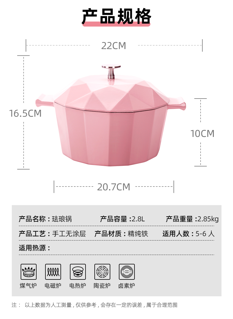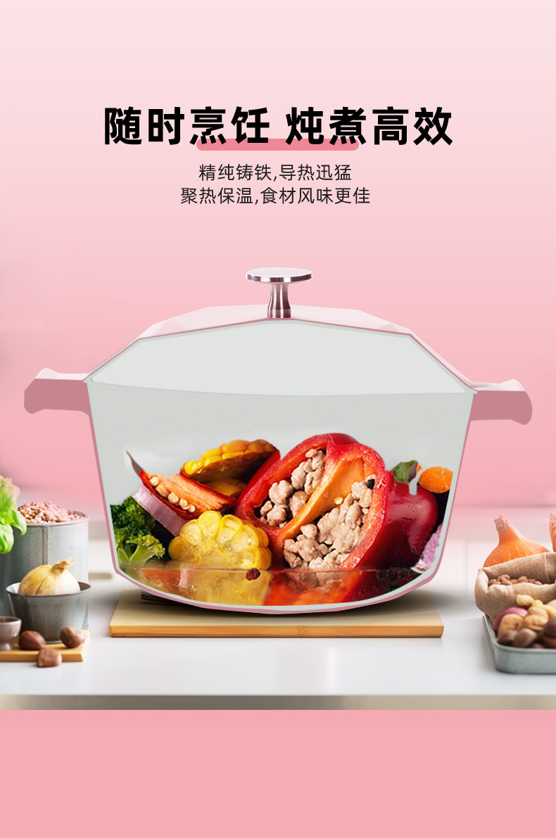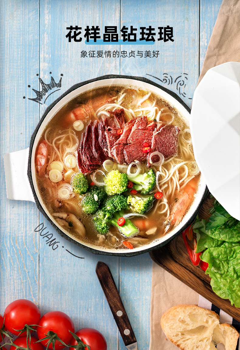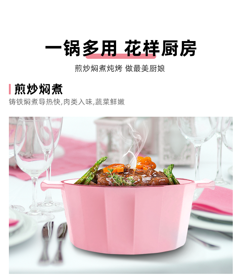 这款韦诺森 Velosan琅铸铁锅,主体采用厚实的天然生铁铸造,内外都融入了进口珐琅釉料,色彩鲜亮,外观颜值高,储热功能良好,密封性强,导热均匀,无论炖、煮、焖、煲、烤都行,一锅多用。