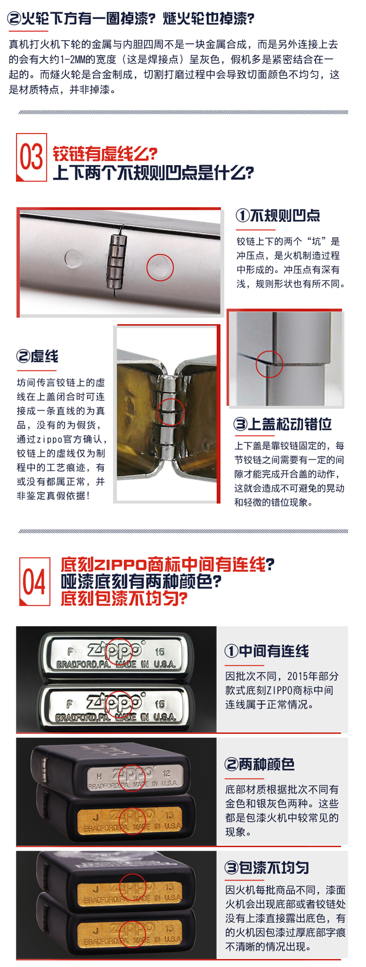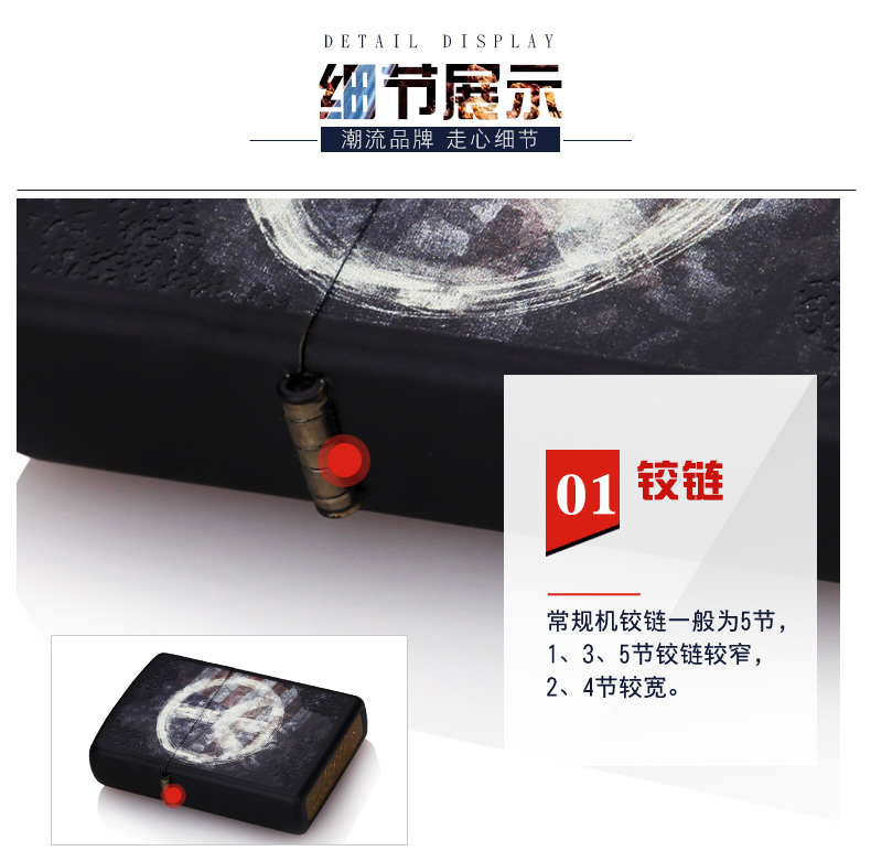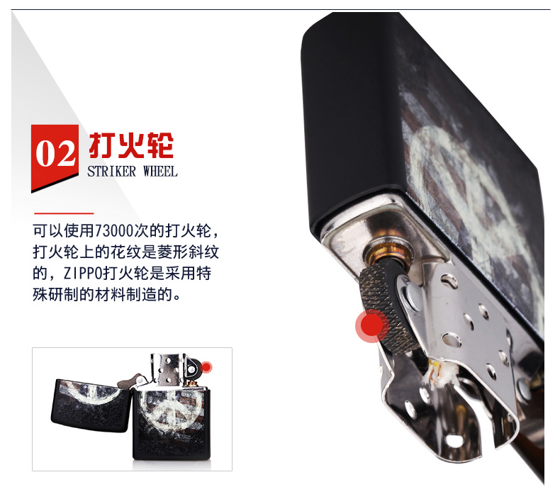 5节开盖铰链,开合顺畅。用特殊材质制造的打火轮,可以使用7.3万次,火轮上还有菱形斜纹,不滑手。拥有经过精密计算的16个防风口,能在任何恶劣天气下尽情燃烧。底部有Zippo的Logo,同时字母D代表4月份,18代表2018年生产,整重55g。