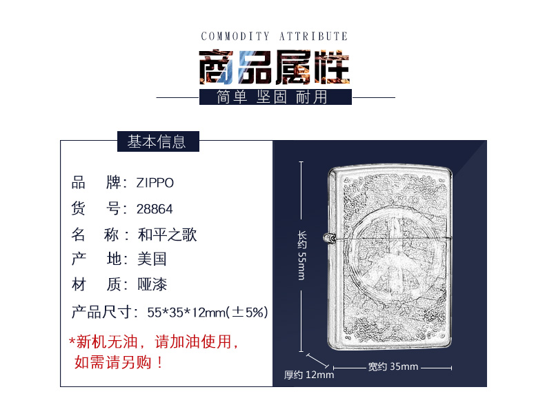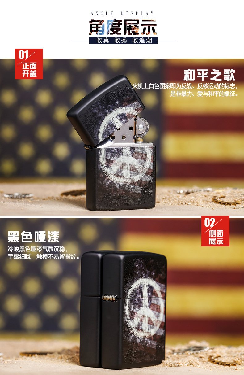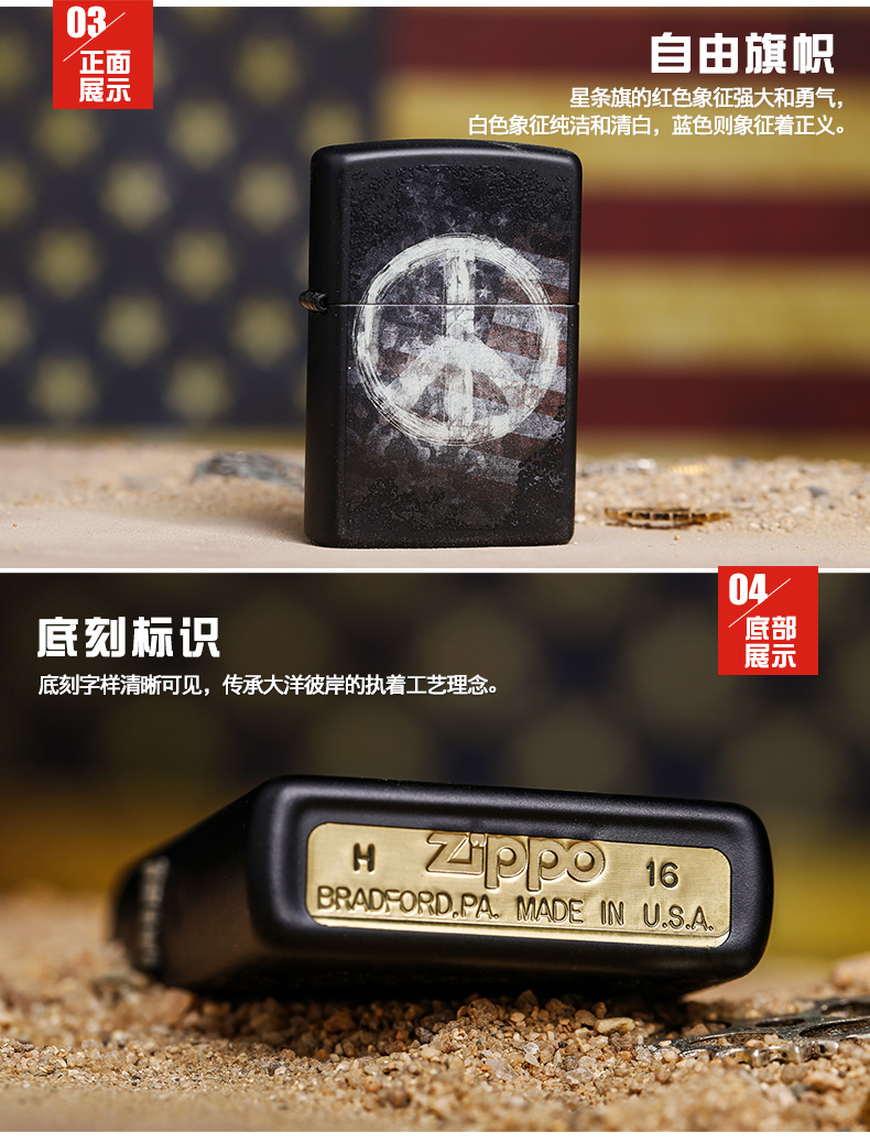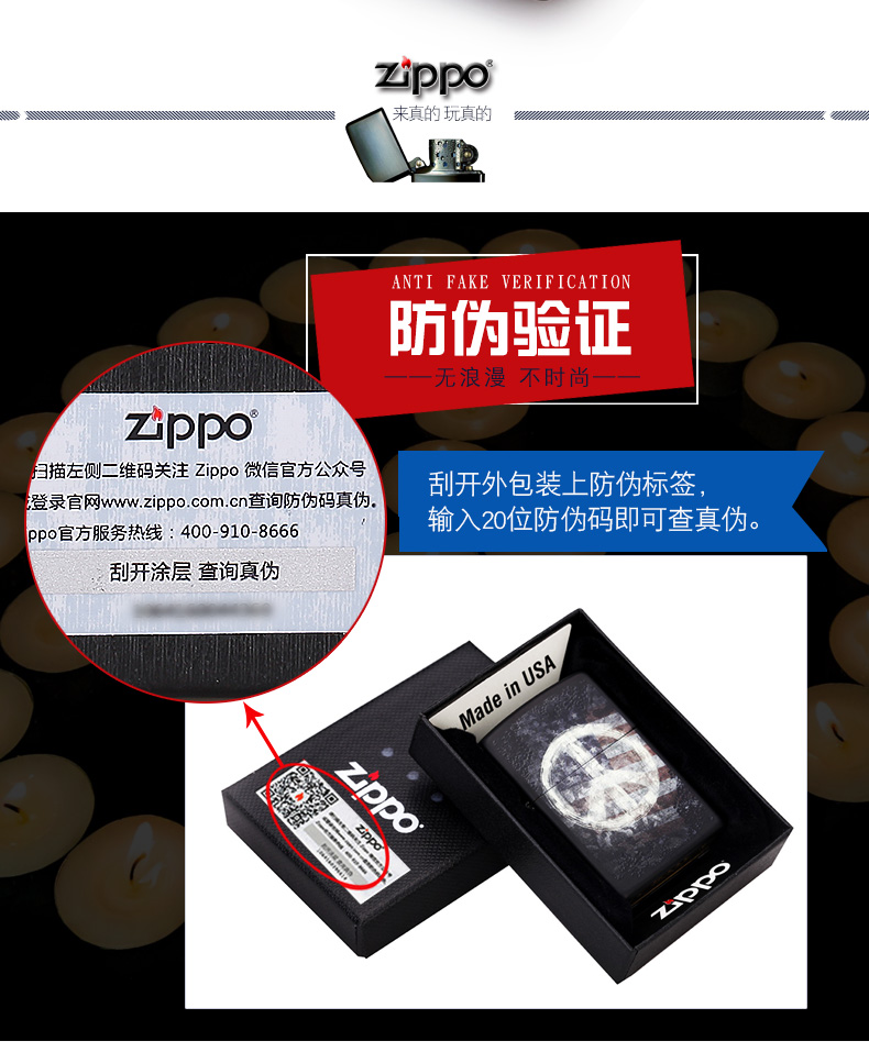 这款Zippo 黑哑漆和平之歌防风打火机,美国原产(火机底部印有made in USA),刮开外包装上的防伪标签,在官网上输入20位防伪码即可验证真伪。
