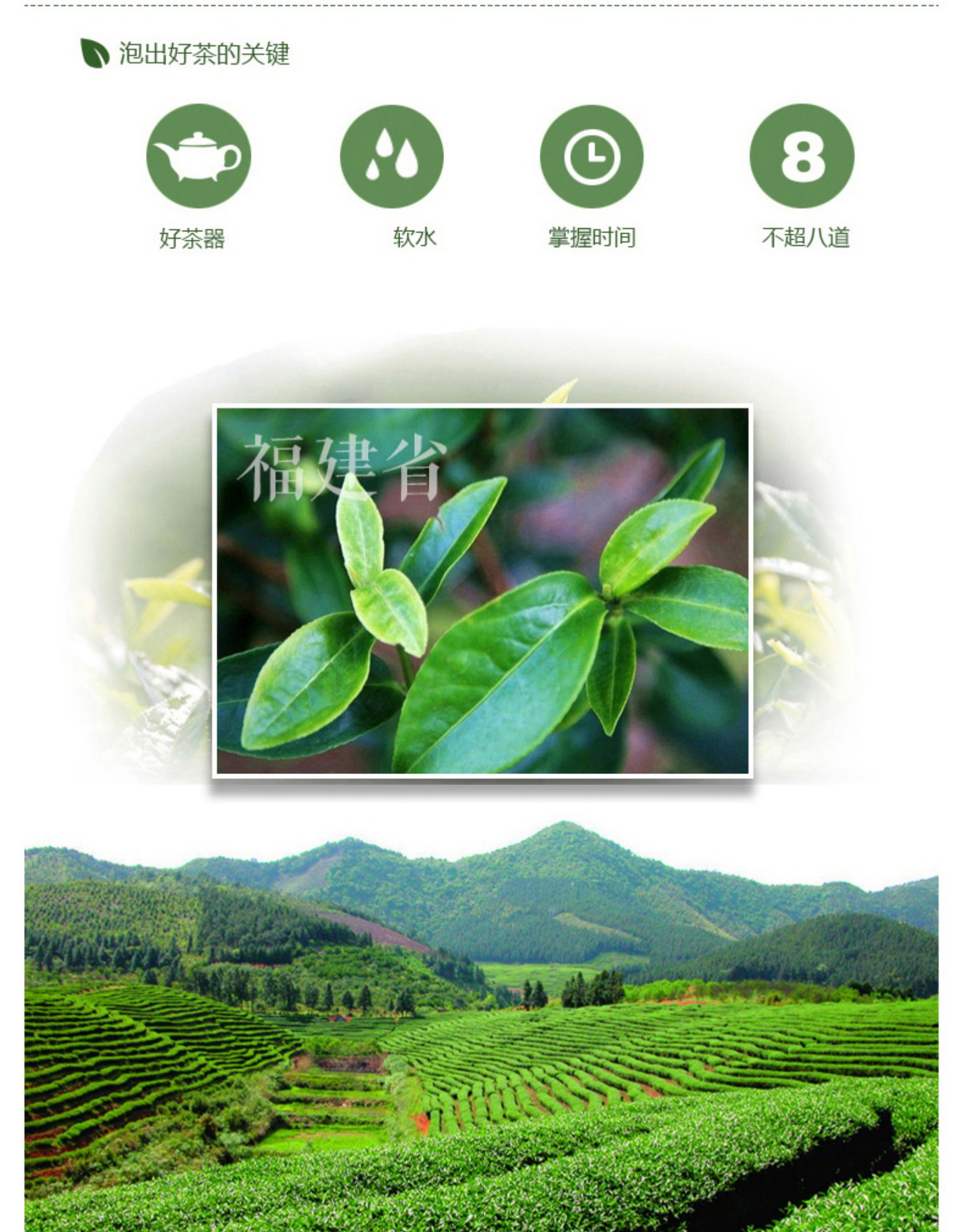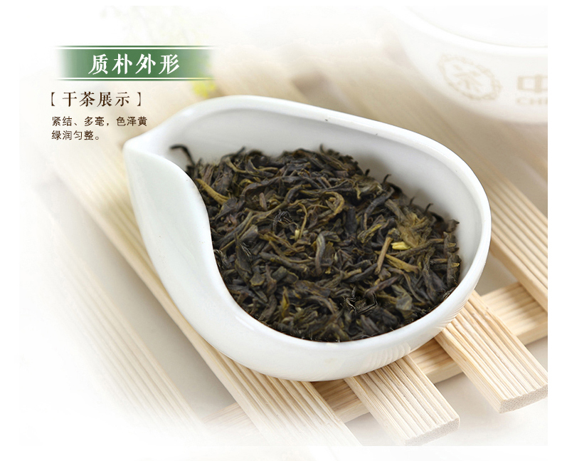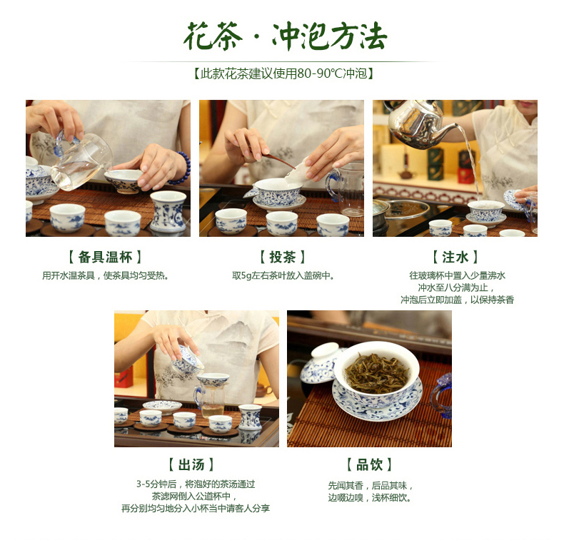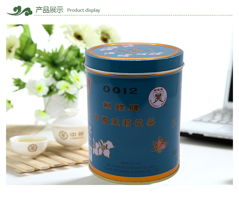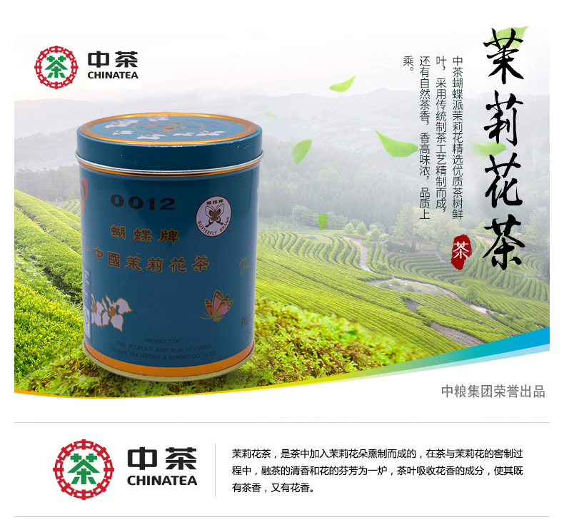 原料选自福建生态茶园,采其春季一芽一、二叶鲜叶,加工而成烘青绿毛茶,精制成茶胚,再选用优质茉莉鲜花窨制而成。茉莉花茶,是茶中加入茉莉花朵熏制而成的,在茶与茉莉花的客制程中,融茶的清香和花的芬芳为一炉,茶叶吸收花香的成分,使其既有茶香,又有花香。规格200g。