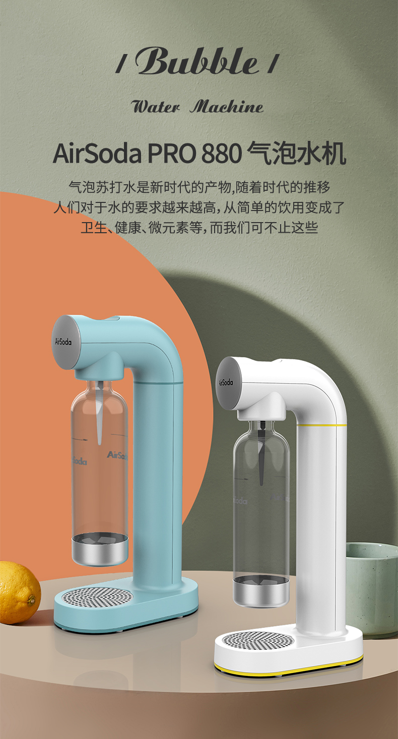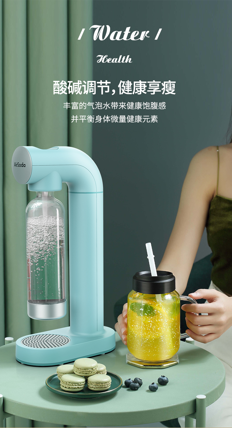这款AirSoda 气泡水机,独家外观专利设计,超高颜值,为生活增添色彩,无需用电,按键后自动弹回泄压,保障开瓶时瓶内压力平衡,更有食品级PET气瓶设计,水瓶容量900mL,产品尺寸239×129×446mm。小编咨询过客服:气瓶免费充,只要付20元来回运费就好。一个气瓶大概可以打50杯+。