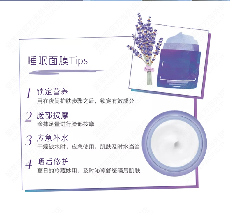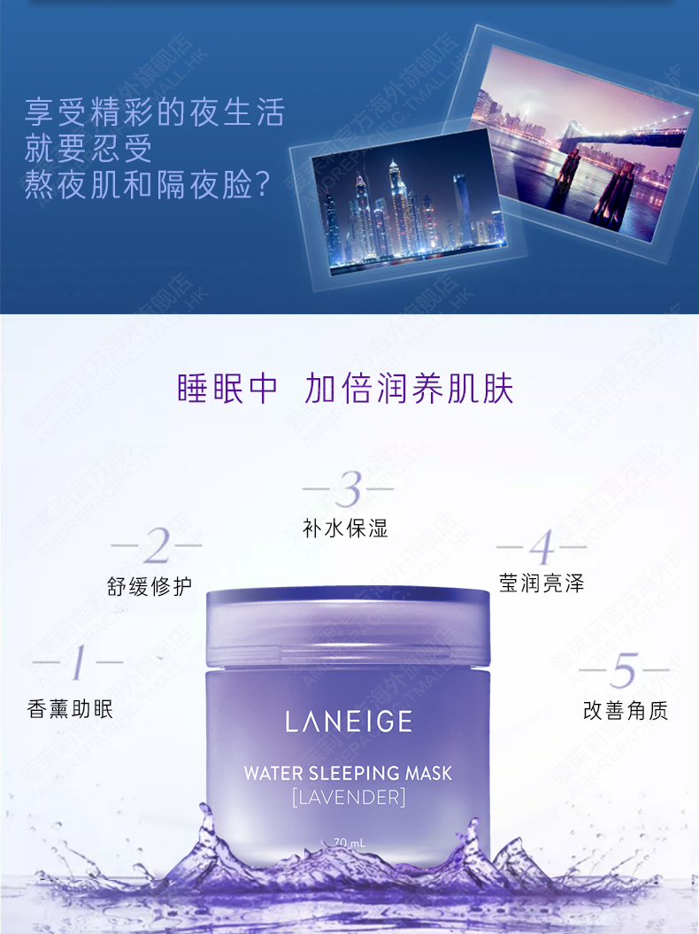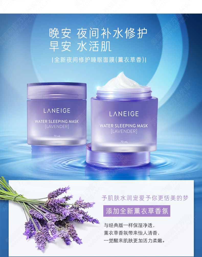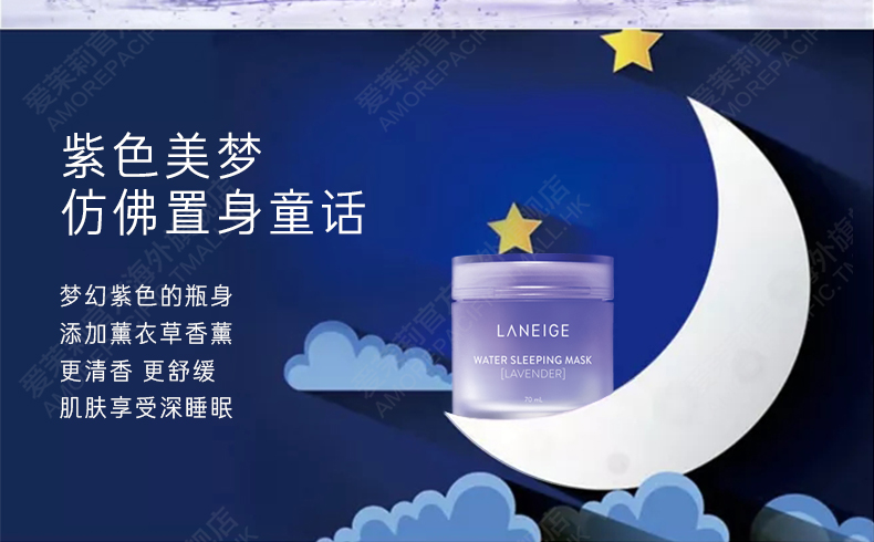 这款韩国LANEIGE 兰芝 夜间修护睡眠面膜(薰衣草),添加全新薰衣草香氛,与经典版一样保湿净透,熨衣草香氛带来怡人清香,一觉醒来肌肤更加活力柔嫩。熟睡间深层补水,提亮暗哑肤色,增强肌肤自我修复功能,紧致肌肤,淡化细纹。适用于所有肌肤,是一款可当面霜使用的面膜。