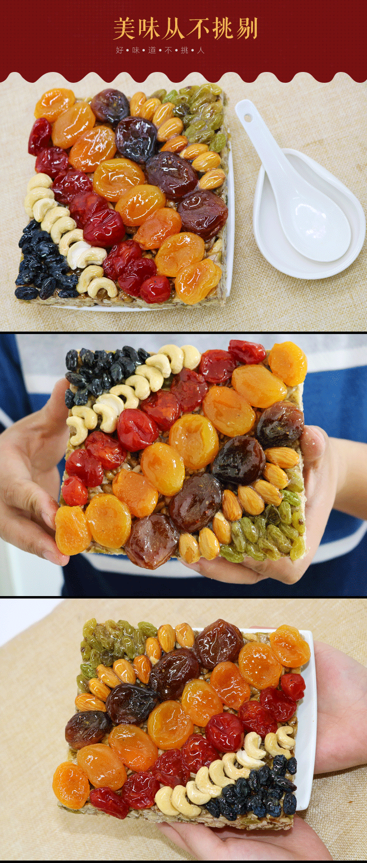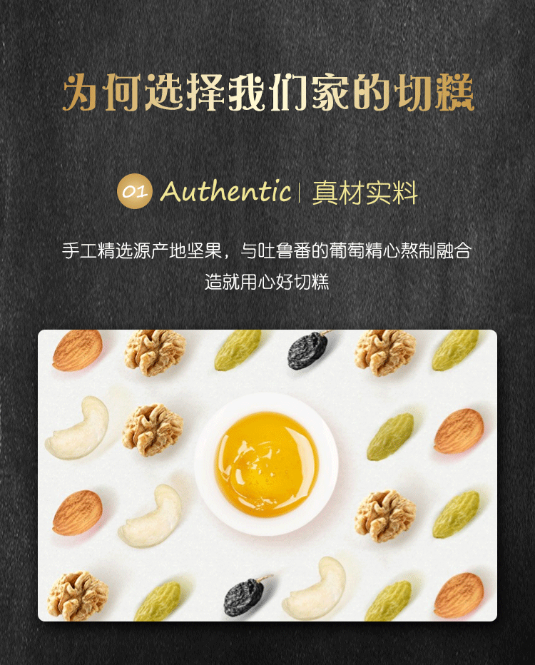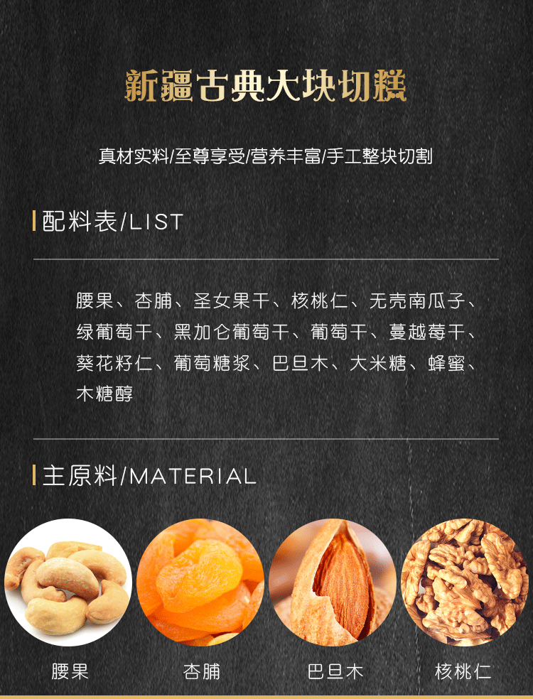 这款新疆正宗纯手工 古典大块切糕,是真正的新疆切糕,首先以稀这家店是我和同事买过三年的老店铺,他家的哈密瓜、杏干、枸杞、葡萄干、无花果等都买来吃过,味道都很不错,不作假,非常非常靠谱。其次店家本人自己就在新疆,他店铺里的所有水果也真的都是新疆直发的。