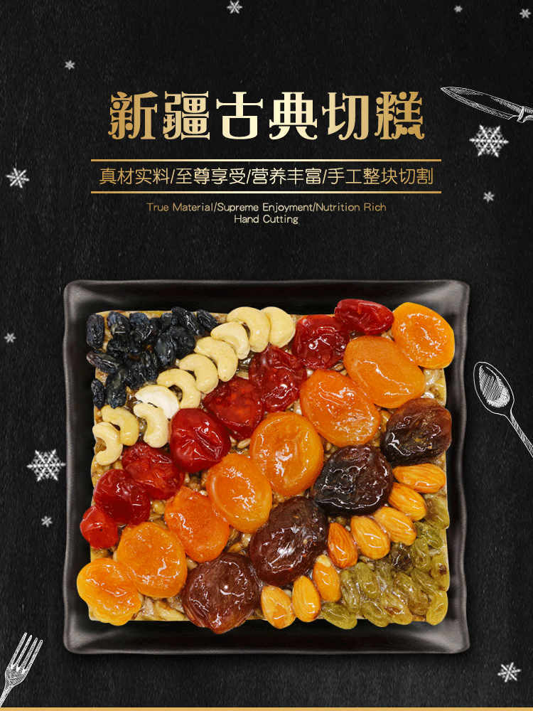 在制作过程中不添加人工色素、防腐剂、甜味剂,规整的小方形,独立小包装,规格是500g。因为切糕是人工做成的,不能做到完全的均匀,所以每一块切糕都是独一无二的。同时切糕中还富含人体所必需的各种营养成分,包括各种氨基酸和微量元素,除了好吃,还对人体有益。