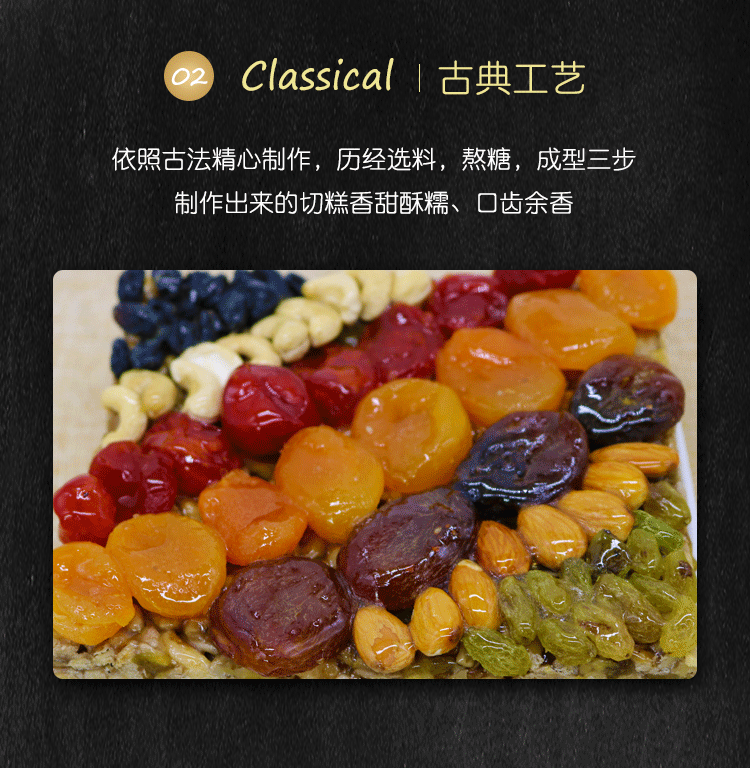 这款切糕的制作,首先把刚新鲜采摘含糖量达30%的甘甜葡萄榨汁,在115摄氏度下熬煮4小时,把90公斤葡萄汁浓缩成30公斤糖浆;然后将腰果、杏脯、圣女果干、核桃仁、无壳南瓜子仁、绿葡萄干、黑加仑葡萄干、葡萄干、蔓越莓干、葵花籽仁、巴旦木等多种坚果放入,最后凝干成型分割好即可。