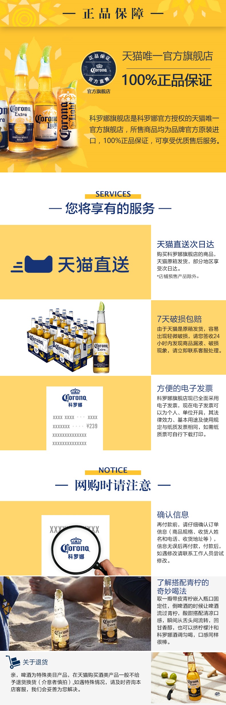 墨西哥人把柠檬随手放入科罗娜中,偶然发现柠檬的酸甜与清凉的科罗娜竟是绝配,此特殊喝法于是在美墨边境流传开来,并成为独一无二的「科罗娜加柠檬」,酸甜的柠檬与清凉的科罗娜啤酒堪称举世无双的绝妙搭配。