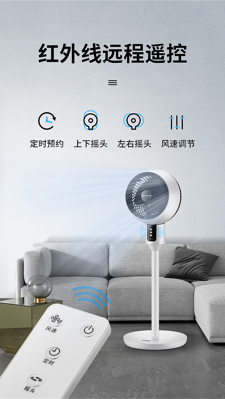 美菱立式空气对流循环扇,可上下左右独立摇头,最远风力能达到6m,远距柔风,久吹不头疼,3档风速调节,支持远程遥控,低噪音不扰眠,四季通用。