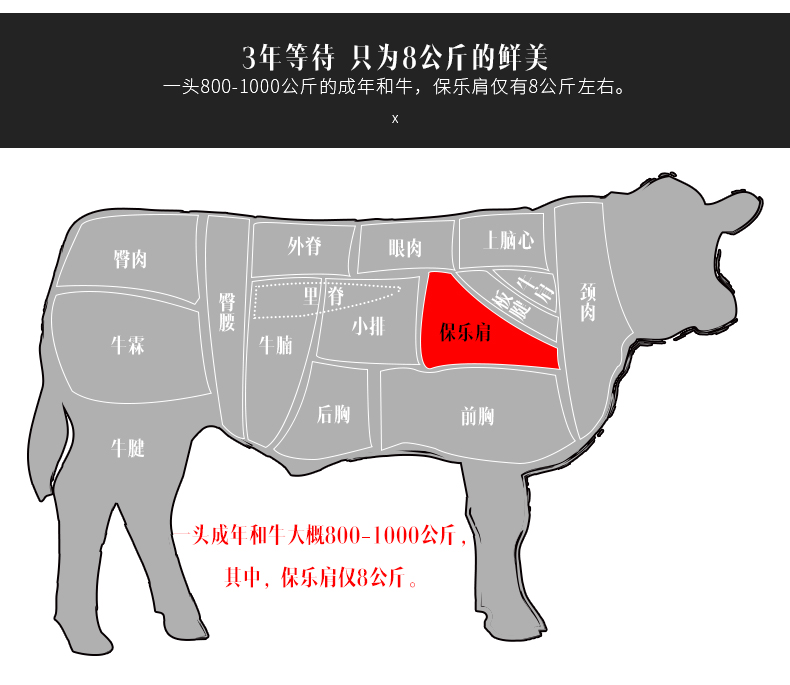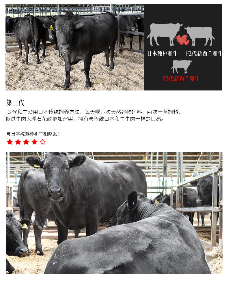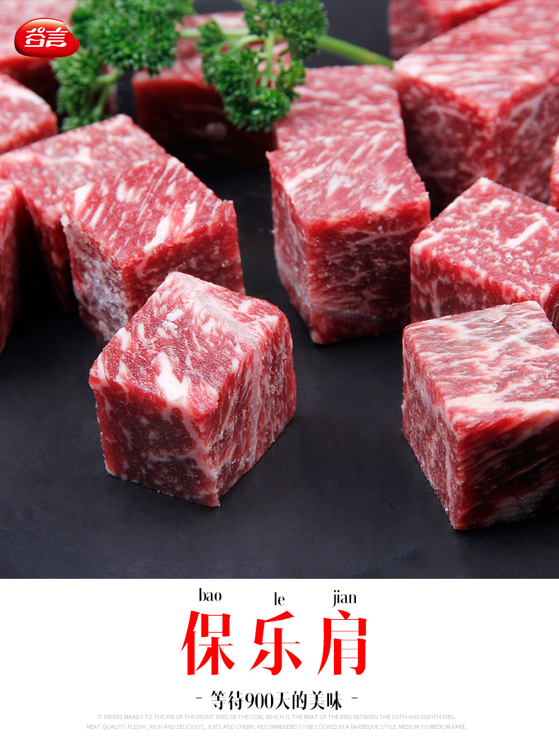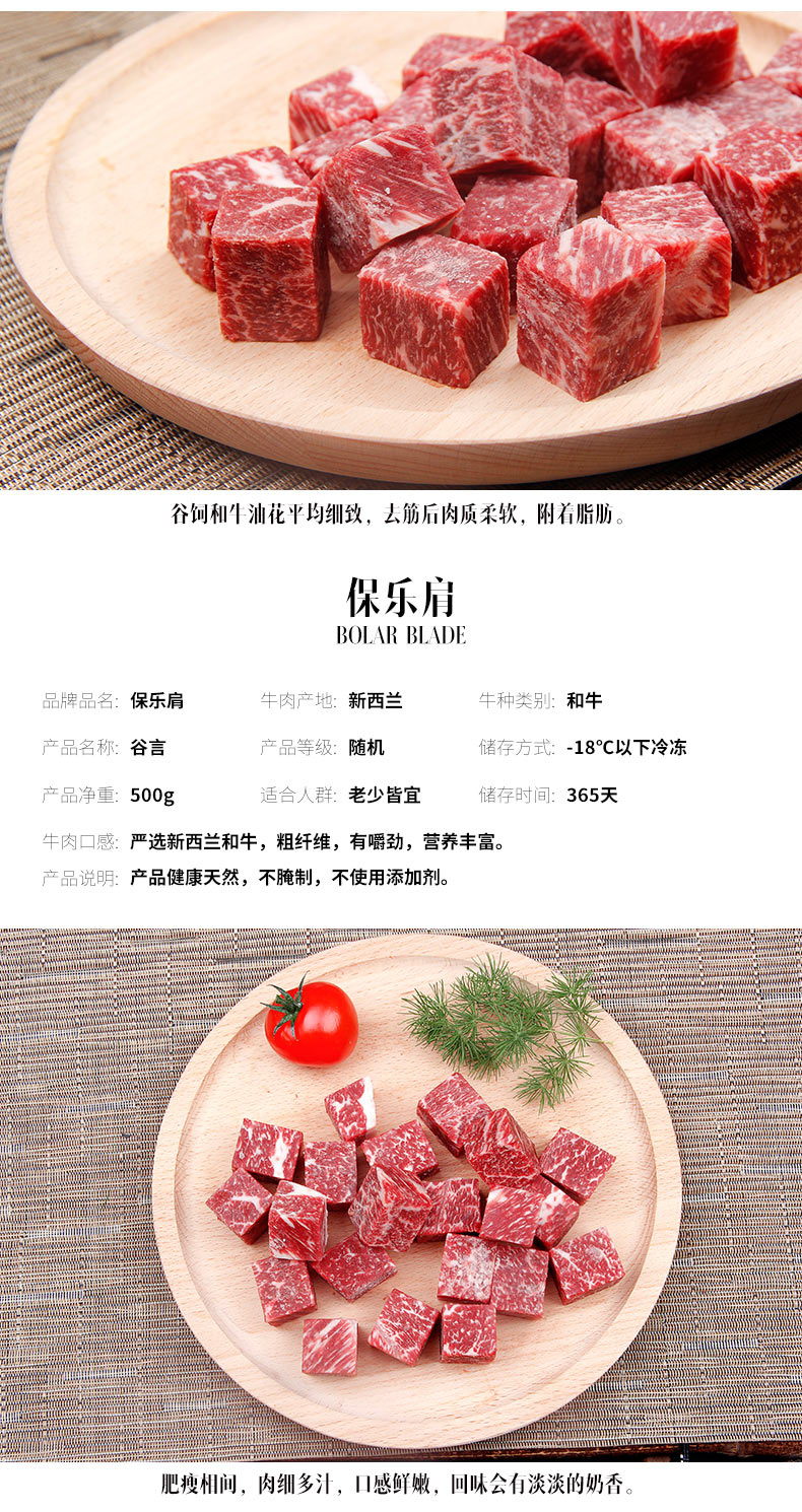 这款谷言牛肉,其牧场位于新西兰霍克斯湾,是世界上和牛养殖基地之一,经过三代杂交培育得到的神户和牛,再经过日本传统和牛饲养法,与日本和牛牛肉拥有一样的口感,具有丰富的大理石纹,选用珍贵的保乐肩肉(牛肩肉)。规格:500g/份。源自新西兰黑毛和牛,谷饲300天以上。