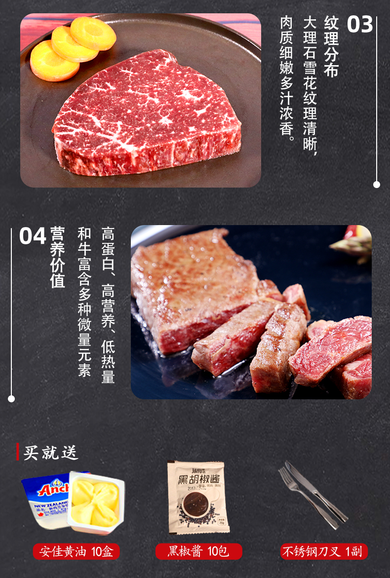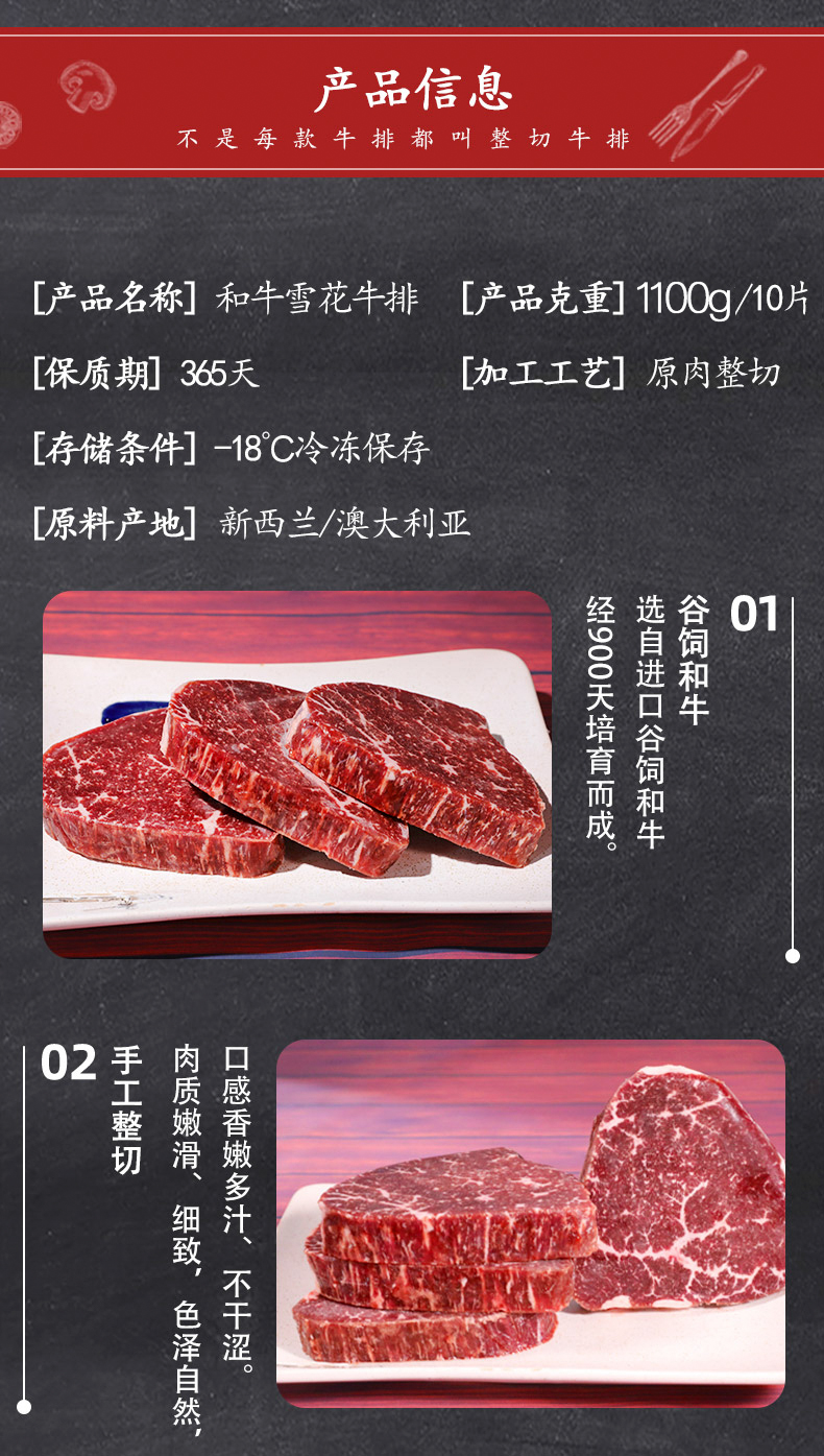 此款和牛雪花牛排,进口谷饲和牛900天培育而成,手工整切,大理石雪花纹理清晰,肉质细嫩多汁不干涩,高蛋白、高营养、低热量,具有丰富的微量元素。