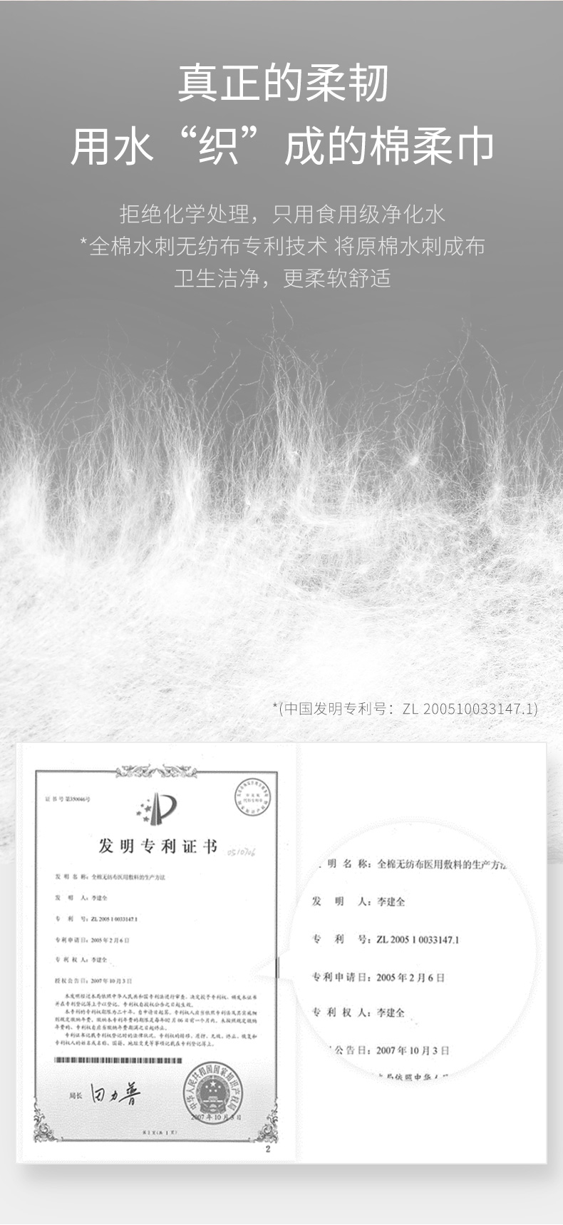 PurCotton全棉时代意为用天然棉花生产出健康、亲肤、高品质的生活护理用品。其核心竞争力在于 “全棉水刺无纺布专利工艺”,能够把原棉处理技术、水刺技术和漂白技术结合在一次,从而将原棉直接制成全棉水刺无纺布。本来这是其母公司稳健医疗希望用来在医用市场替代医用纱布的专利,但却因为缺乏认证标准而无法进入海外市场,不得已发展成民用却大获成功,填补了众多生活用品运用全棉材质的空白。