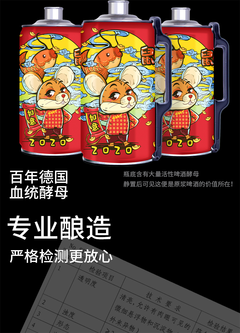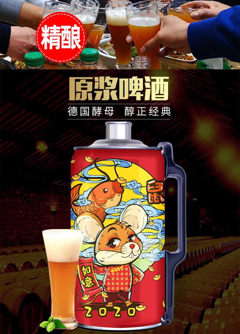 这款青岛特产 鼠年贺岁版 精酿原浆啤酒,精选新疆天山雪域啤酒花、美国进口卡斯卡特、西楚等啤酒花、澳洲进口麦芽、百年德国血统酵母及青岛本地草花山·千龙山深层地下253米泉水为原料,严格遵循德国1516《啤酒纯净法》酿造,不添加任何人工添加剂,酒体浑浊醇厚,馥郁饱满,呈原浆迷雾状,圆润的麦芽浓香中透散出清新的果香、香草香和酵母香,收口清新怡人、果香四溢,酒精度≥4%vol,原麦汁浓度10.7°P,净含量2L/桶。