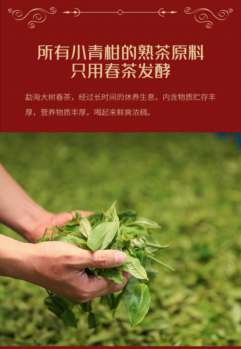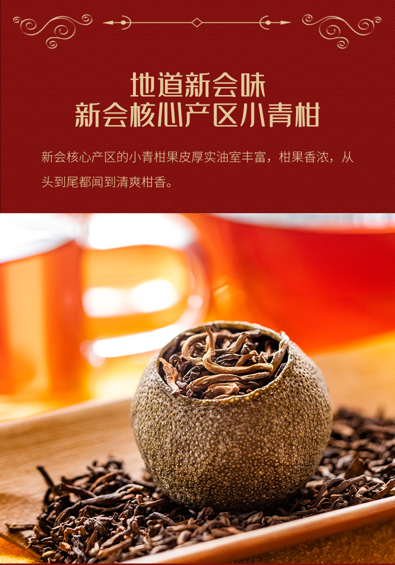 这款采用核心产区七月柑,勐海大叔春茶制成,小青柑果实厚实油室丰富,柑果香浓,茶为果香相互交融,口感细腻耐泡,回味无穷。采用独立包装设计,便于冲泡保存。规格:100g/件。