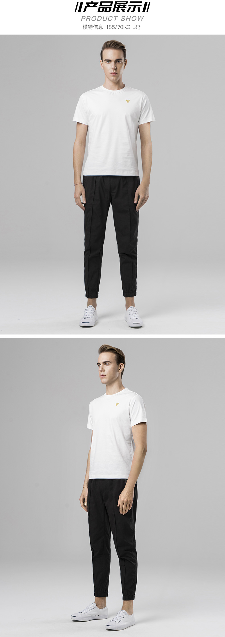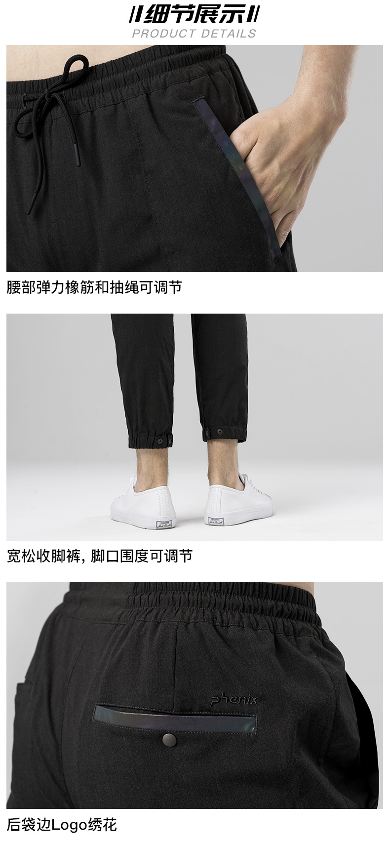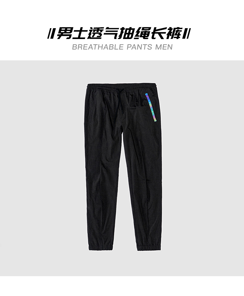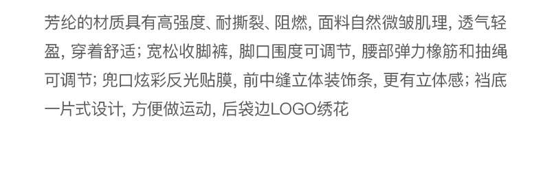 在款式上,微锥形裤脚设计,宽松收脚口,脚口围度可调节不紧勒。腰部是弹力橡筋+抽绳调节的组合,大多数人都能穿。两侧兜口有炫彩反光贴膜,前中缝有立体装饰条,更有立体感;裆底是一片式设计,方便做运动,后袋边有Logo绣花。