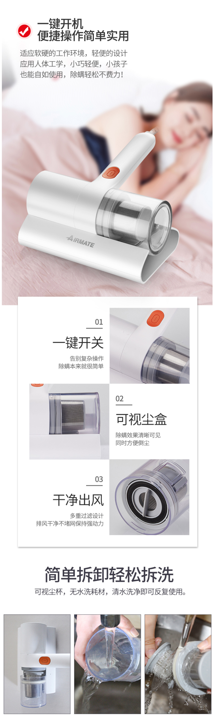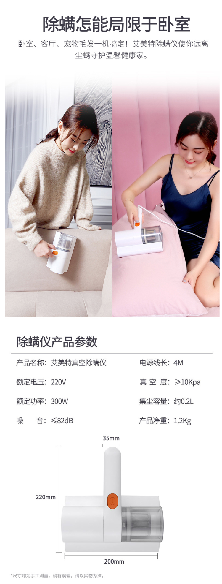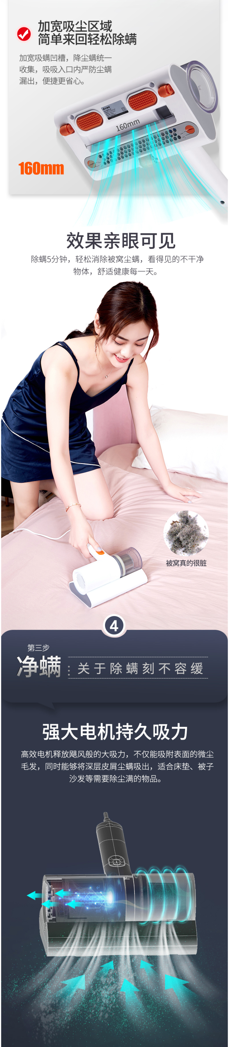 宽吸口的无刷吸头设计,不仅能减少毛发缠绕,还能大大提高吸收的效率;0.2L可视化透明尘杯,除螨效果清晰可见,耐磨可水洗;整重1.2kg的轻量化机身,女性使用时轻松省力。