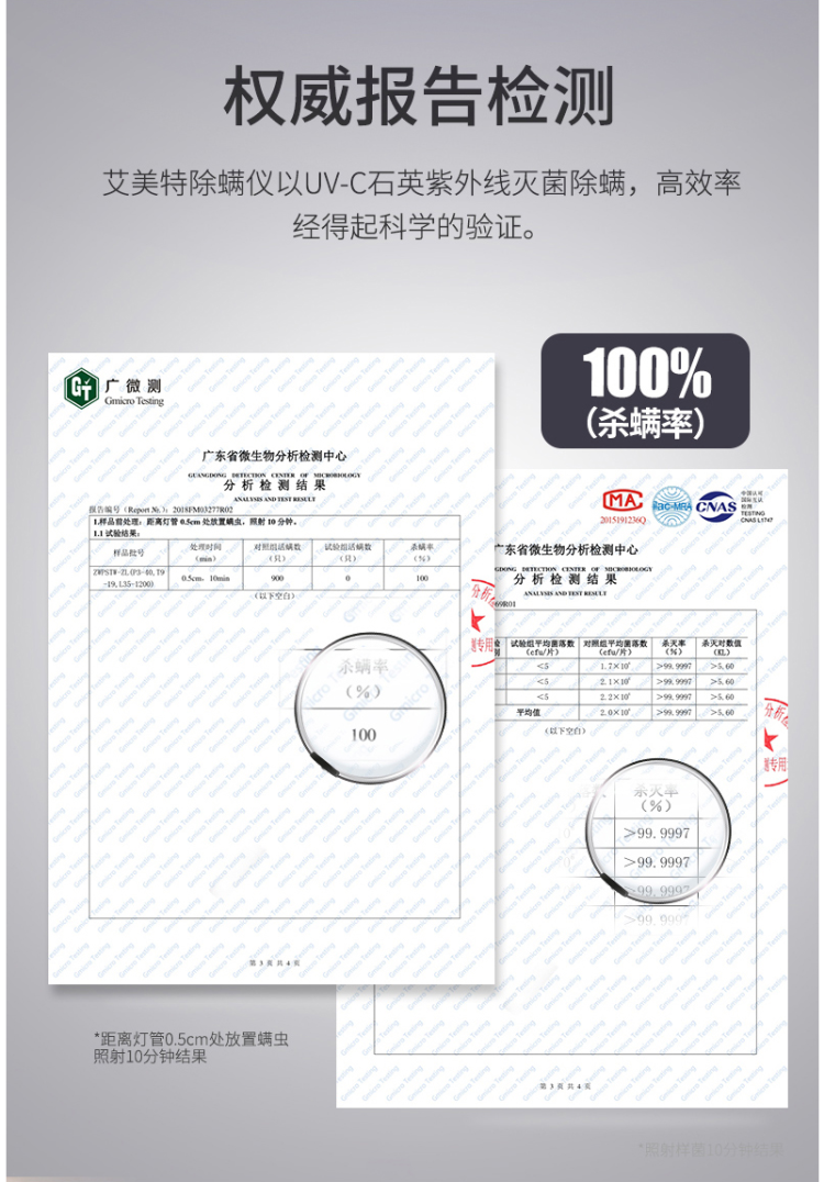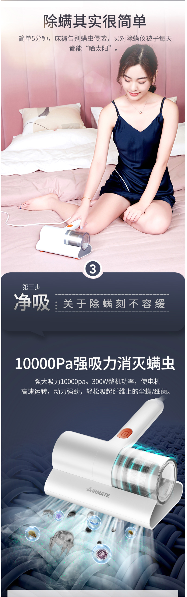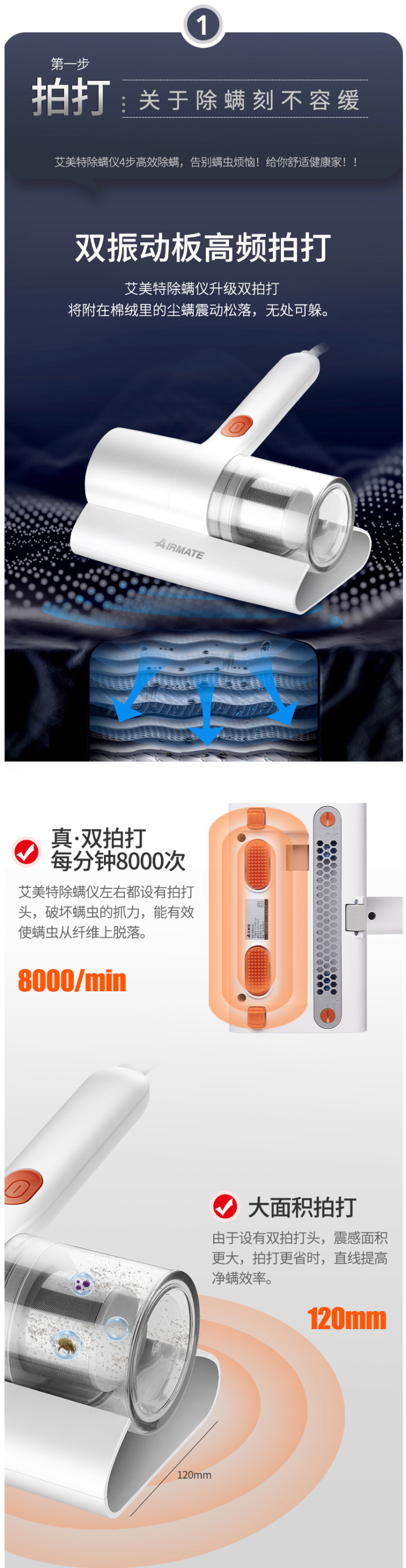 这款艾美特 LVH1002-U01手持式除螨仪,会在织物表面进行约8000次/min的双振动板高频拍打形成强震,震出深藏在床褥中的螨虫,然后回旋气流配合约10000Pa的飓风式吸力,轻松吸走尘螨,最终可达到除螨率100%、除菌率99.99%的效果。