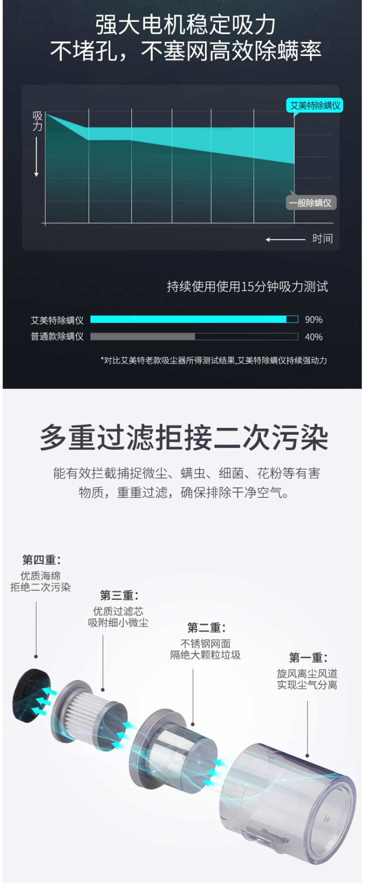 在吸取过程中,吸取的空气会经过四重过滤,使得整机灰尘的二次排放拦截率达99.97%,有效拦截捕捉微尘、螨虫、细菌、花粉等有害物质,排除干净空气。