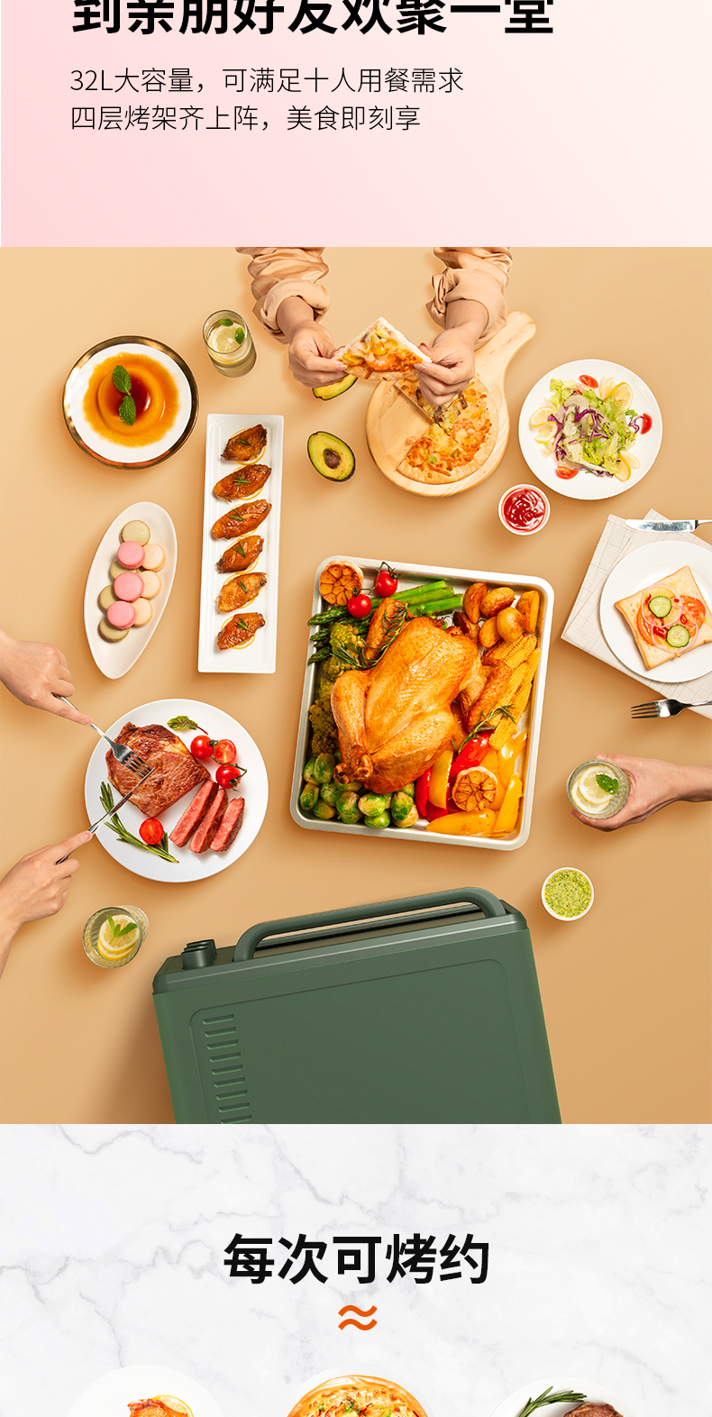 天猫九阳本丰专卖店,13-20日 天猫618大促¥229元 狂欢价,-30元优惠券,=199元 到手价,32L大容量电烤箱 暗夜绿/气球粉双色可选。颜值超级高的一款,放在外面当做摆件也非常有气质,和现在流行的北欧风、现代风家装风格适配度极高。