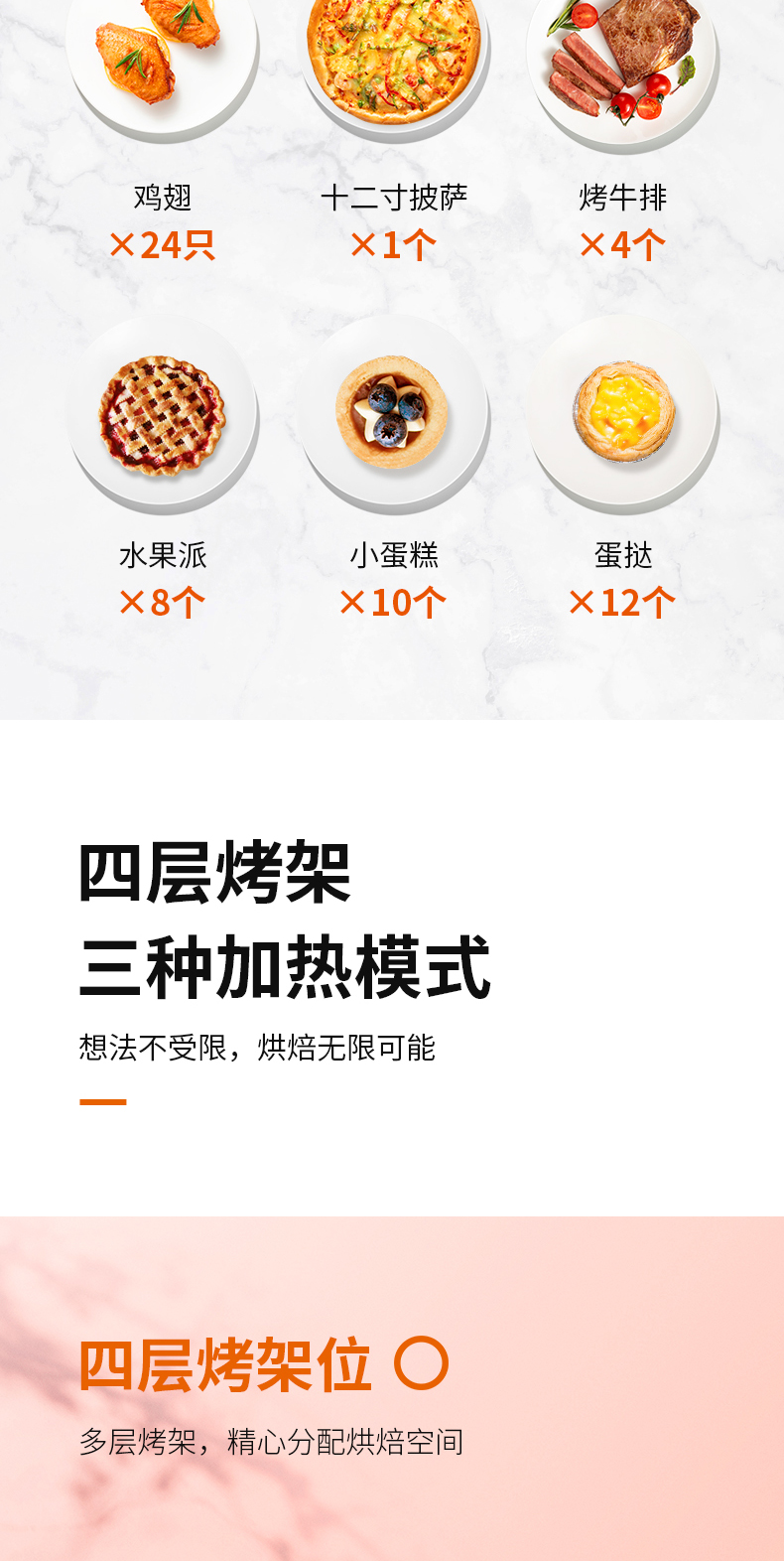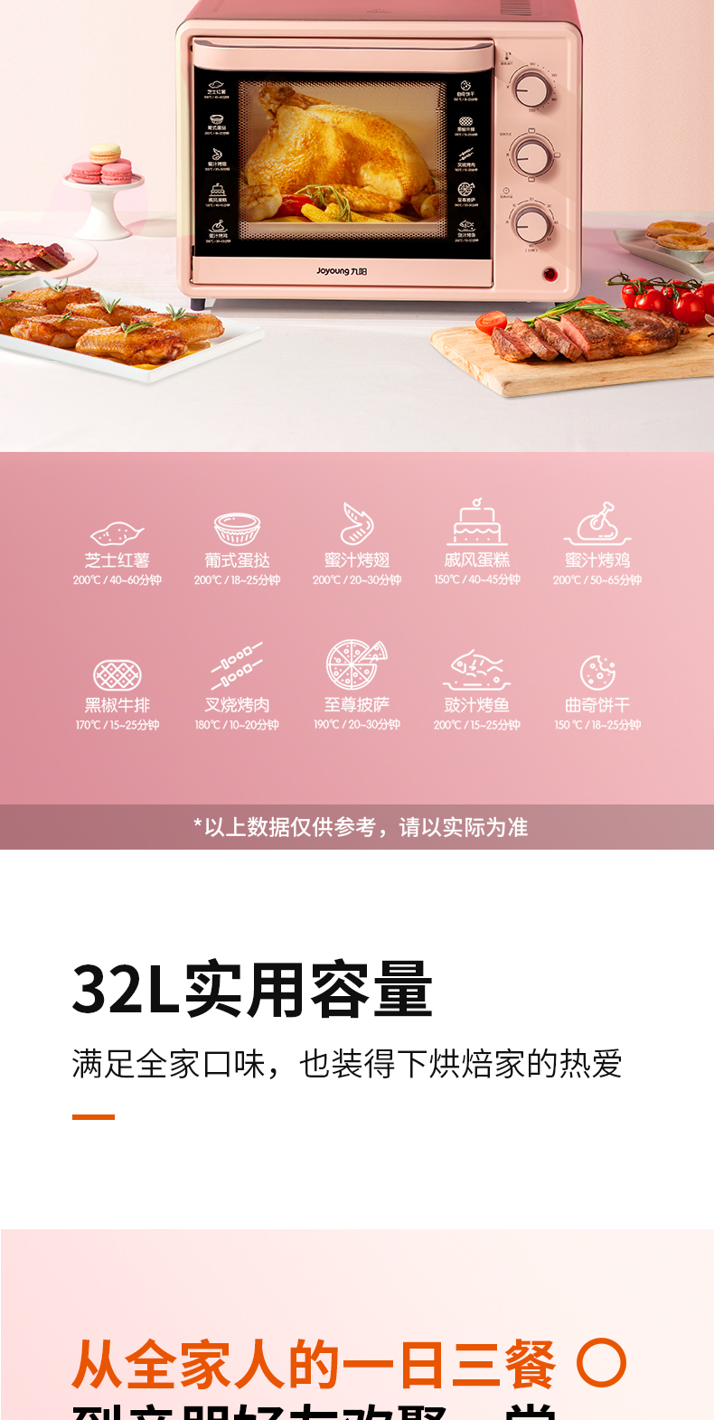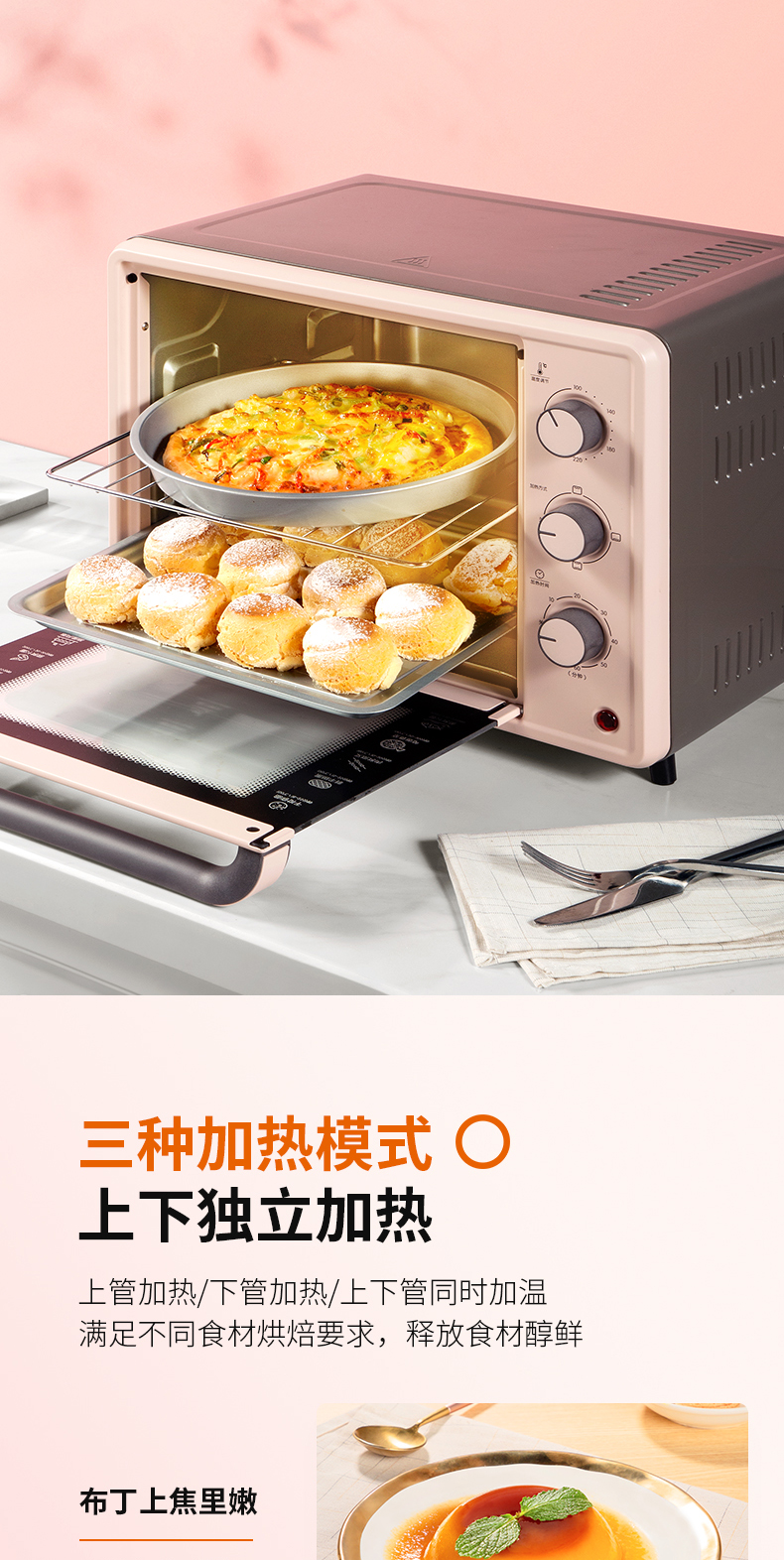 32L的容量,中等体积,可烤12寸pizza和牛排4片,4层烤架位,容量够用,上下独立控温,全不锈钢发热管,发热迅速,全面烘烤,三组旋钮式设计,简单易上手,新手小白也可以轻松烘焙。