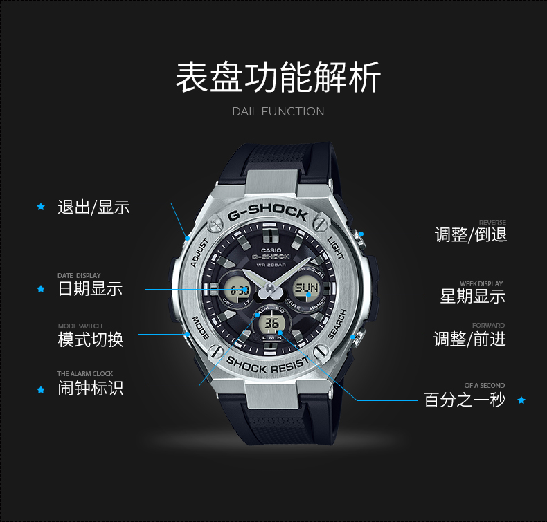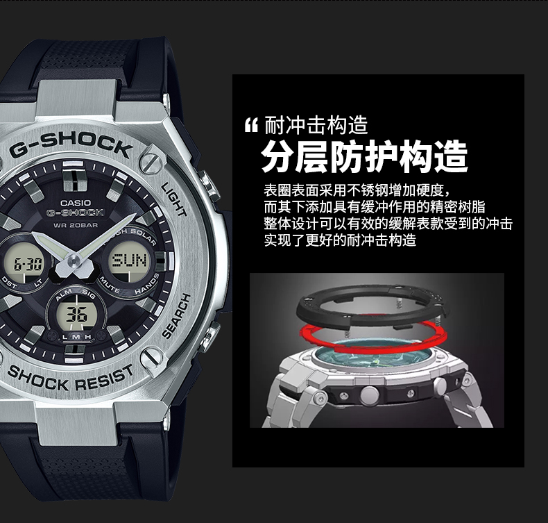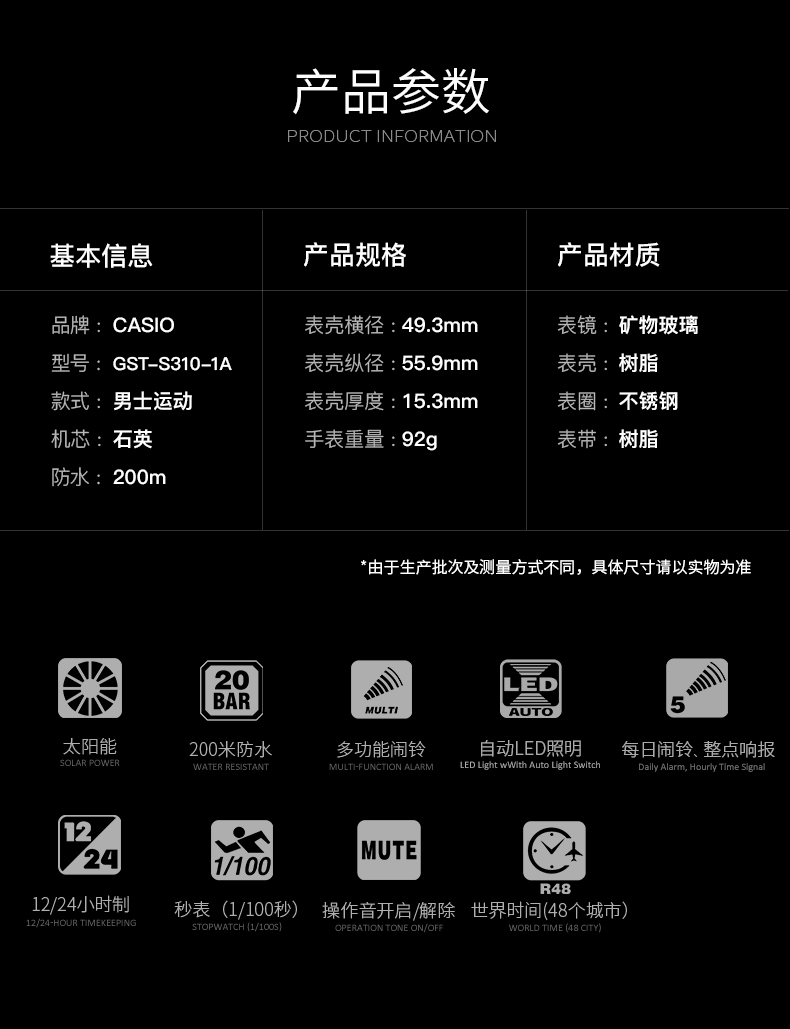 卡西欧的运动型手表,表壳的不锈钢表盘和光动能是我心动的地方,采用光动能的机芯,可以将日光转化为电能,搭配大容量的蓄电池,能够保证走时精准,表圈上层采用硬派不锈钢设计,在其下添加精密树脂材质,能够有效防止冲击对机芯的上海,耐看耐用。