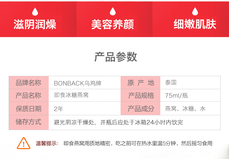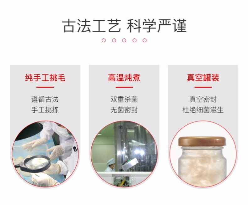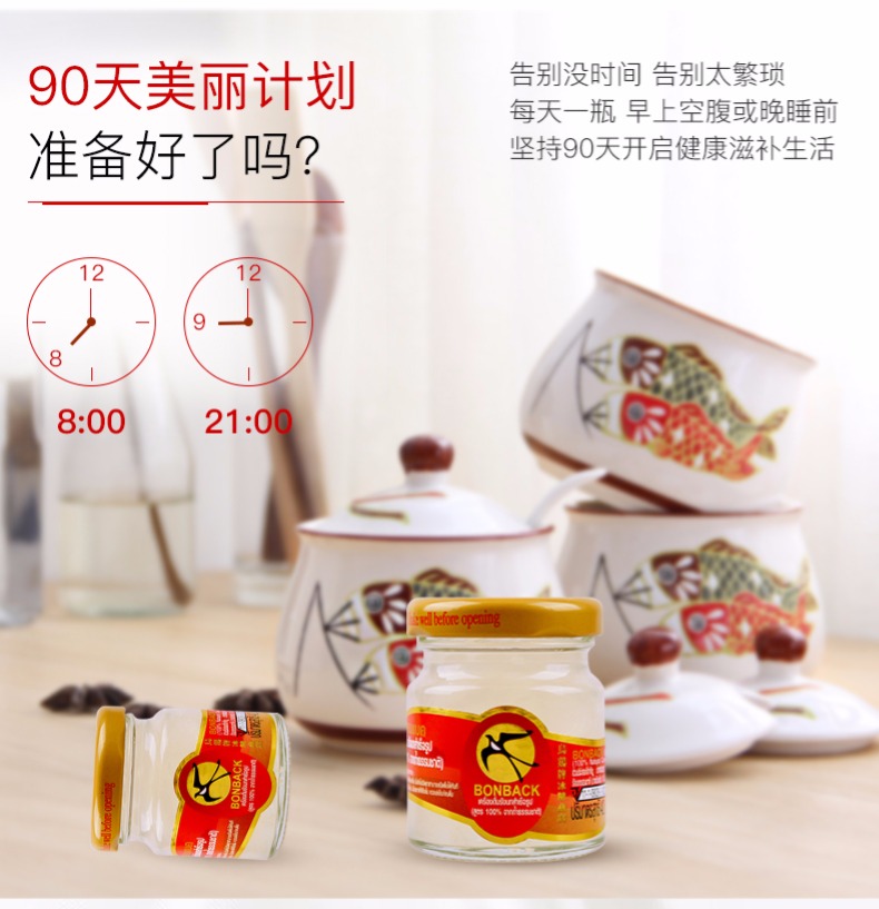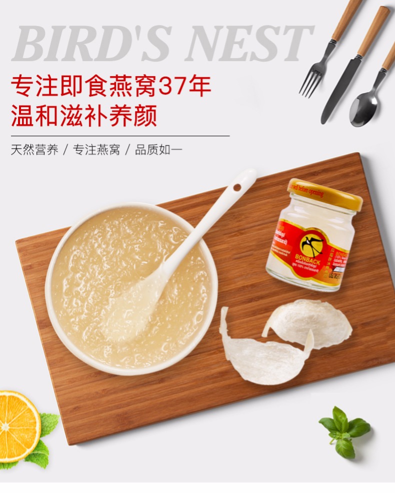 Bonback对燕窝的品质要求极高,3次纯手工挑毛,保证燕盏的干净,并且不能破坏盏形,燕窝的燕丝也必须非常细密,燕角也细,内部囊丝较少,确保其柔软的口感和营养价值,然后经过双重杀菌,最后真空罐装。0添加、0琼脂,开盖即食,规格是45ml*6瓶。
