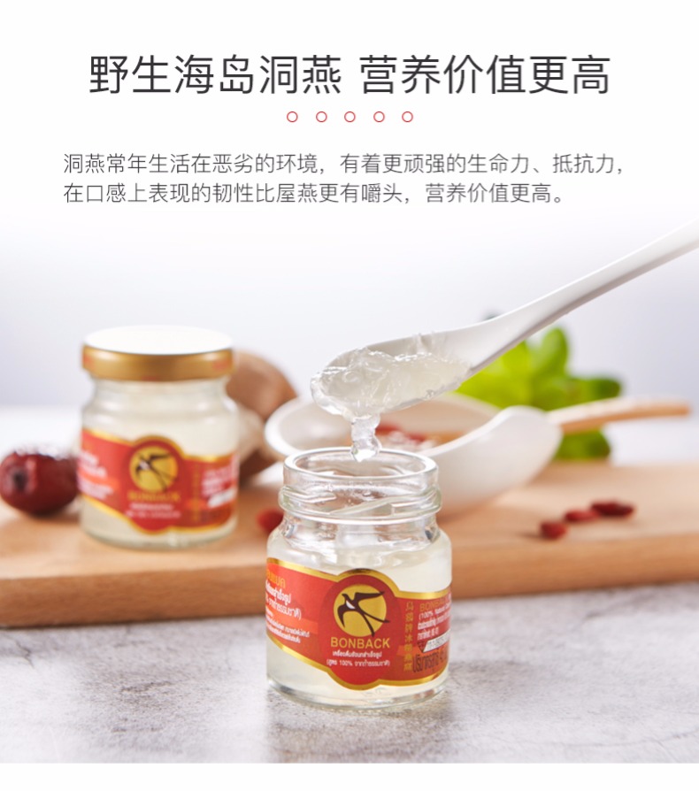 泰国特产即食燕窝已经成了中国游客赴泰旅游的必买特产,其中以产自泰国南部的Bonback燕窝最为热销。燕窝以出色的保健和医疗功效、极高的营养价值著称。