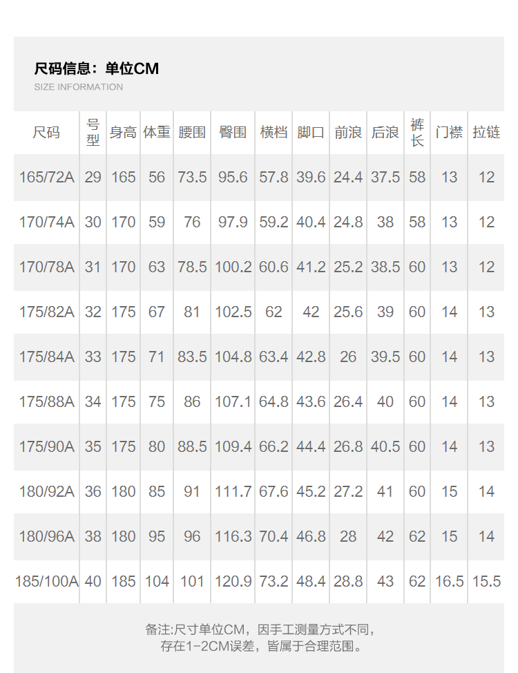 合体版型,基本不挑身材。门襟处使用日本高品质YKK拉链,细节精致到位。腰袢与裤脚走线均匀紧密,耐磨耐穿。简约直筒款式,没有多余装饰,休闲百搭。
