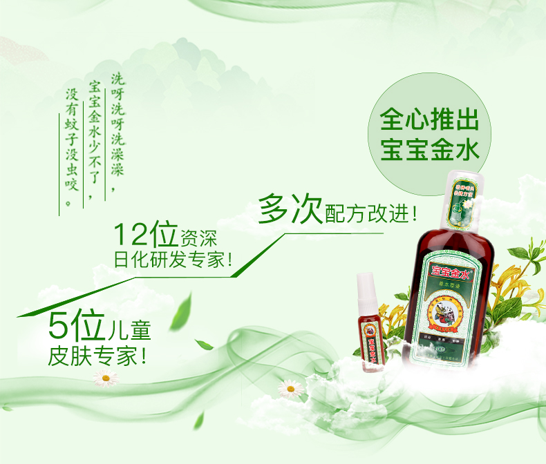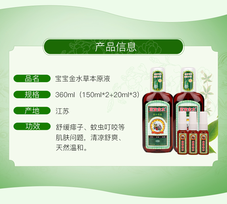 夏日防蚊刚需,驱蚊止痱子,国货经典。宝宝金水 草本原液花露水套装 360ml共5瓶,包括2瓶150ml正装和3瓶20ml便携装。