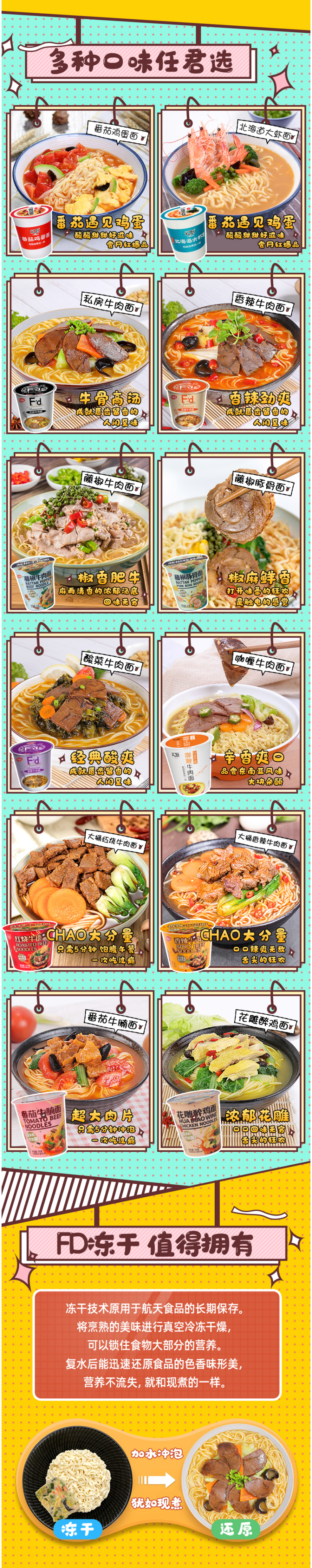 FD方便面,一改我国传统方便面的油炸工艺,采用FD技术对面条进行脱水干燥,既避免了因为油炸而带来的对营养的破坏和损失,又保留了面条的原汁原味,可以说是一种绿色食品,方便面面条不经过油炸,保质期相对延长,复水性也较好,一上市就受到消费者的广泛关注。