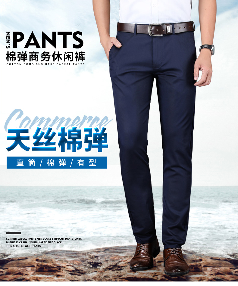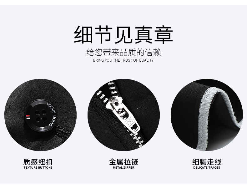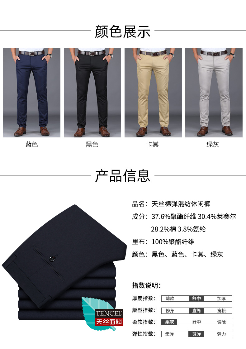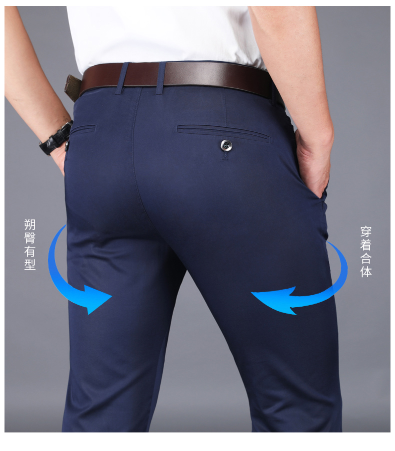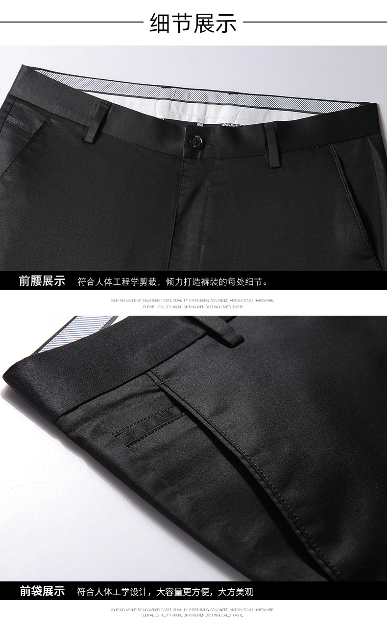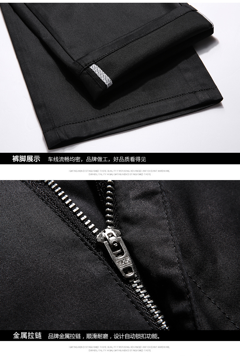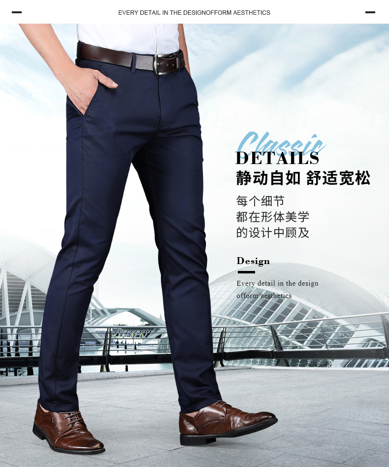 版型上,整体采用立体裁剪工艺,合体修身版型,很好地修饰使身材,显得人挺拔有型。门襟处采用日本高品质YKK拉链,提拉顺畅,经久耐用。后袋装饰性纽扣简洁大方,细节到位。经典直筒款式,休闲商务百搭穿着。