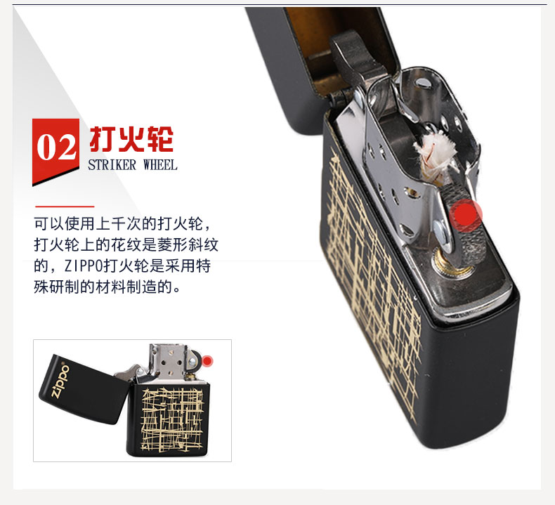 5节开盖铰链,开合顺畅。用特殊材质制造的打火轮,可以使用7.3万次,火轮上还有菱形斜纹,不滑手。拥有经过精密计算的16个防风口,能在任何恶劣天气下尽情燃烧。底部有Zippo的Logo,同时字母D代表4月份,18代表2018年生产,整重55g。
