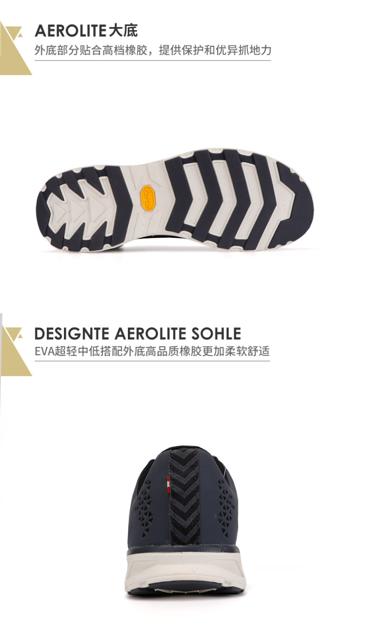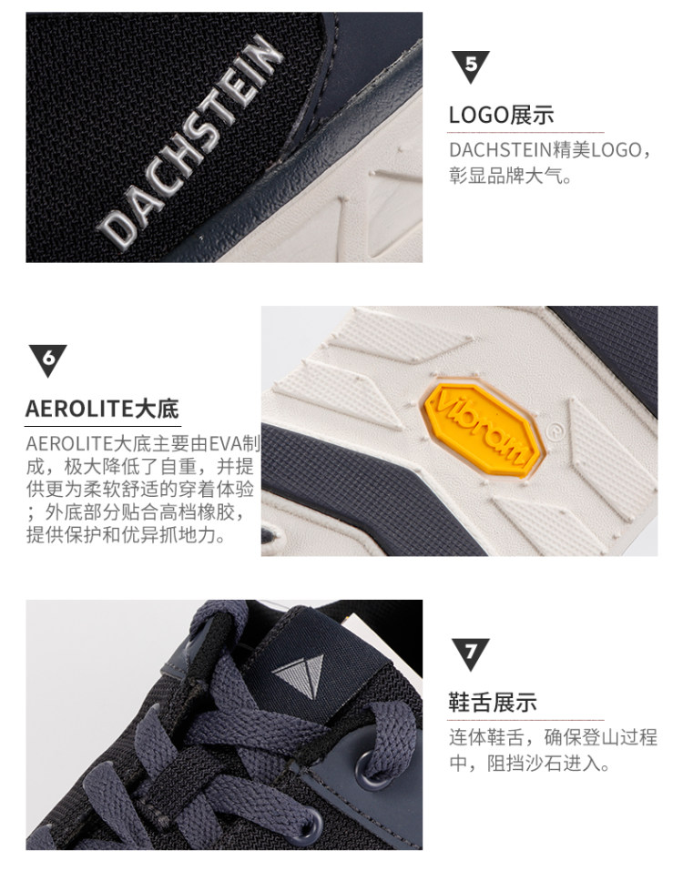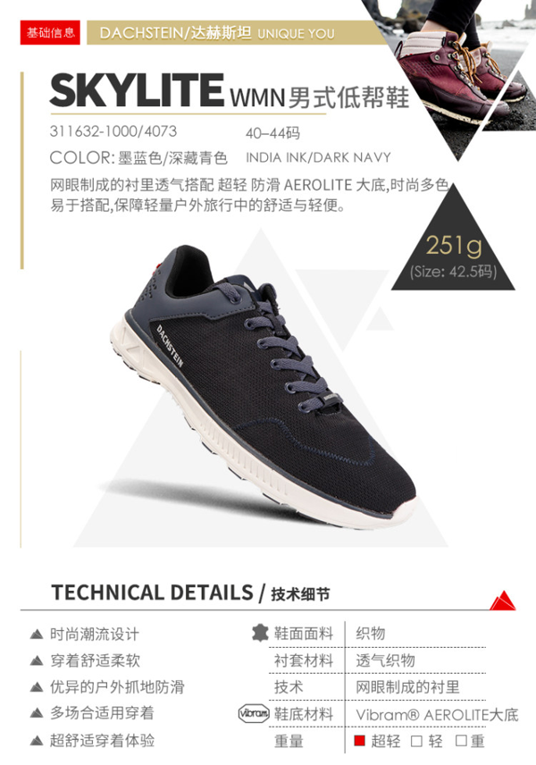 达赫斯坦Skylite,是定位超轻量级旅行户外鞋,鞋底与意大利Vibram联合研发,专属Vibram Aerolite超轻大底,主要由EVA制成,极大降低了自重,并提供更为柔软舒适的穿着体验;外底部分贴合高档橡胶,以增强耐久和抓地能力。Vibram作为全球最知名的大底品牌,主做橡胶大底,以EVA为主的大底极为稀有。在鞋面上,这款鞋底使用织物鞋面,也有效减轻重量,鞋头是防撞设计。